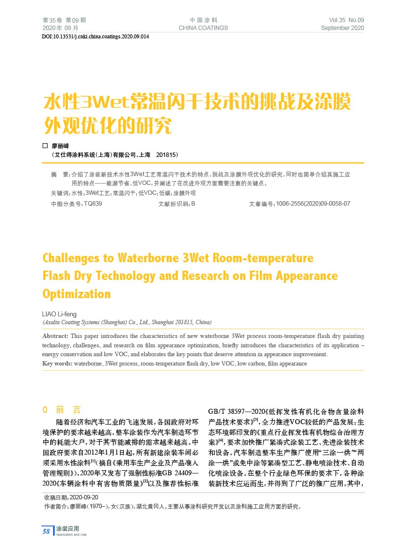 介紹了涂裝新技術水性3Wet工藝常溫閃干技術的特點、挑戰及涂膜外觀優化的研究,同時也簡單介紹其施工應用的特點——能源節省、低VOC,并闡述了在改進外觀方面需要注意的關鍵點。