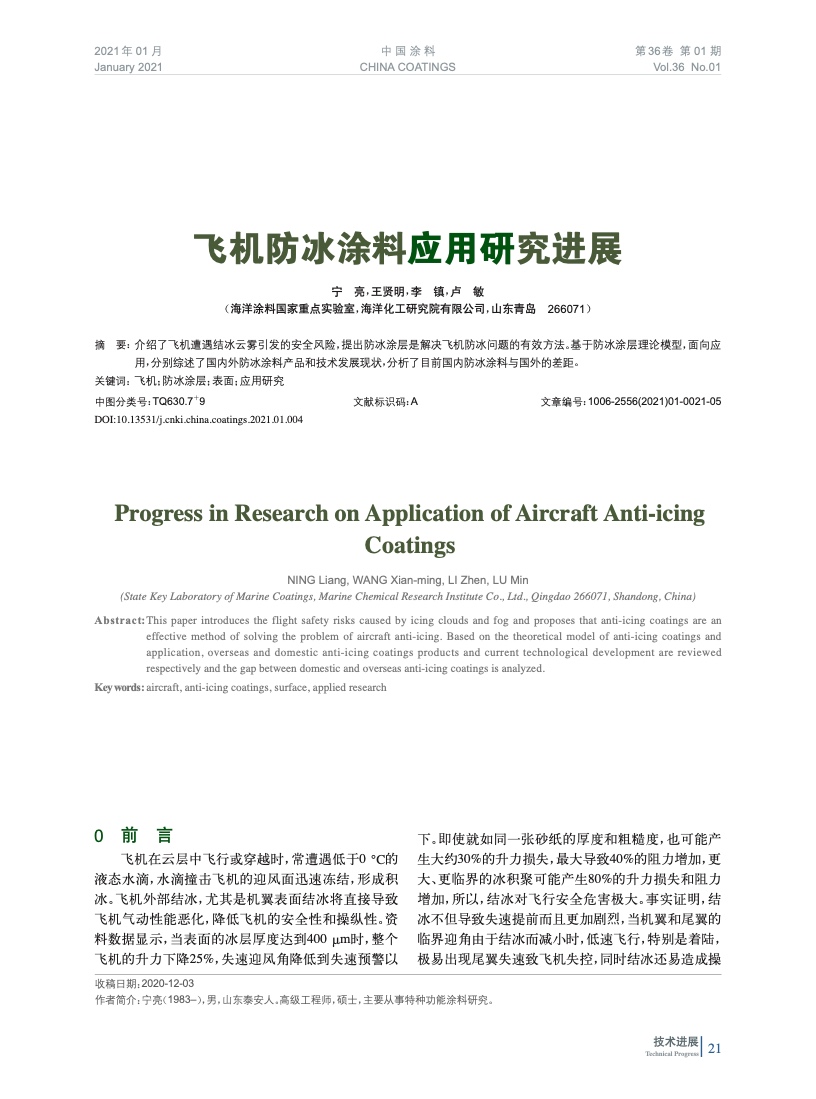 介紹了飛機遭遇結冰云霧引發的安全風險,提出防冰涂層是解決飛機防冰問題的有效方法。基于防冰涂層理論模型,面向應用,分別綜述了國內外防冰涂料產品和技術發展現狀,分析了目前國內防冰涂料與國外的差距。