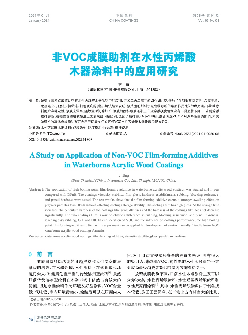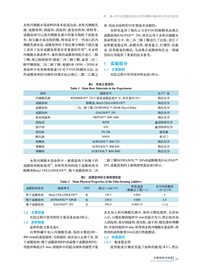 非VOC成膜助劑在水性丙烯酸木器涂料中的應(yīng)用研究