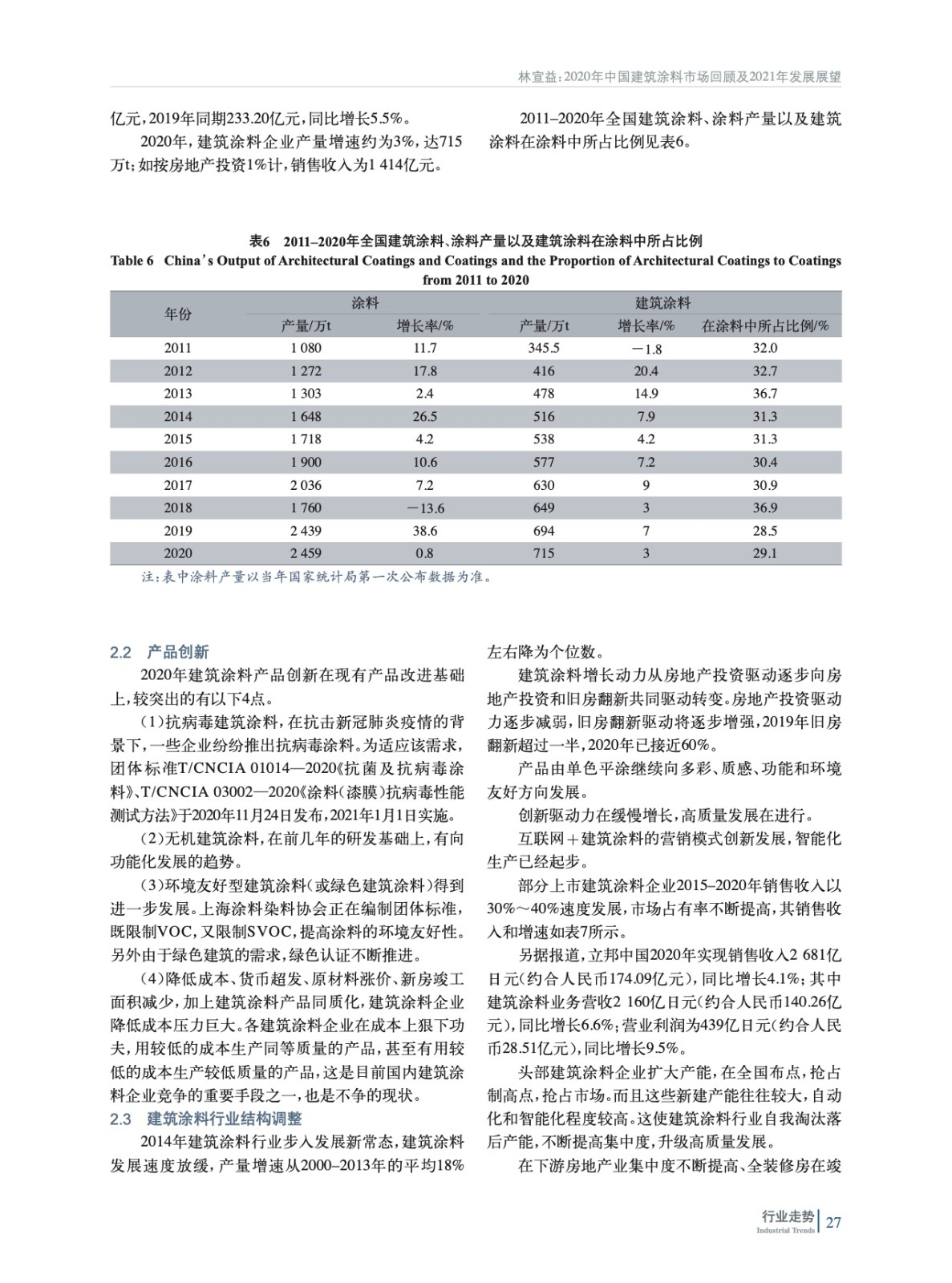 介紹了2020年我國建筑涂料的發展背景和動力,從產量和銷售收入、產品創新、行業結構調整、固體廢物鑒定、標準發布實施等方面總結了建筑涂料2020年現狀,并對2021年建筑涂料發展趨勢進行了展望。