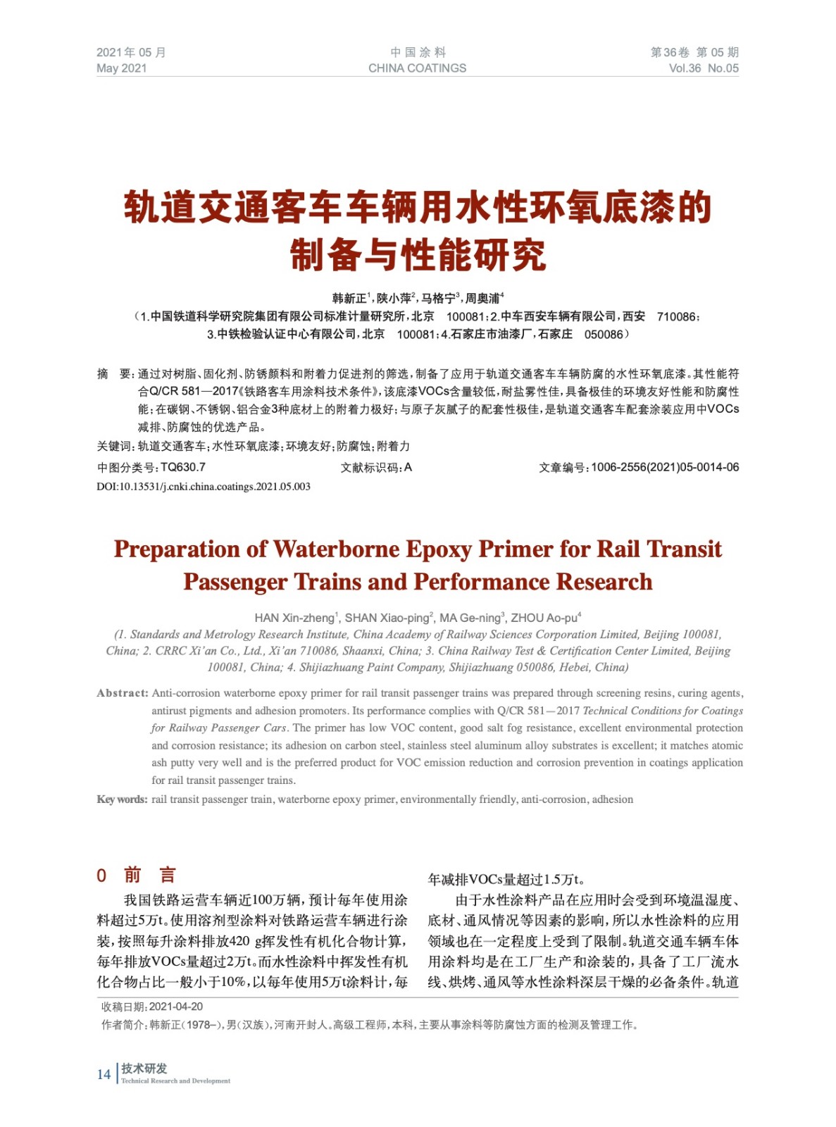 摘要:通過對樹脂、固化劑、防銹顏料和附著力促進劑的篩選,制備了應用于軌道交通客車車輛防腐的水性環氧底漆。其性能符合Q/CR 581—2017《鐵路客車用涂料技術條件》,該底漆VOCs含量較低,耐鹽霧性佳,具備極佳的環境友好性能和防腐性能;在碳鋼、不銹鋼、鋁合金3種底材上的附著力極好;與原子灰膩子的配套性極佳,是軌道交通客車配套涂裝應用中VOCs減排、防腐蝕的優選產品。