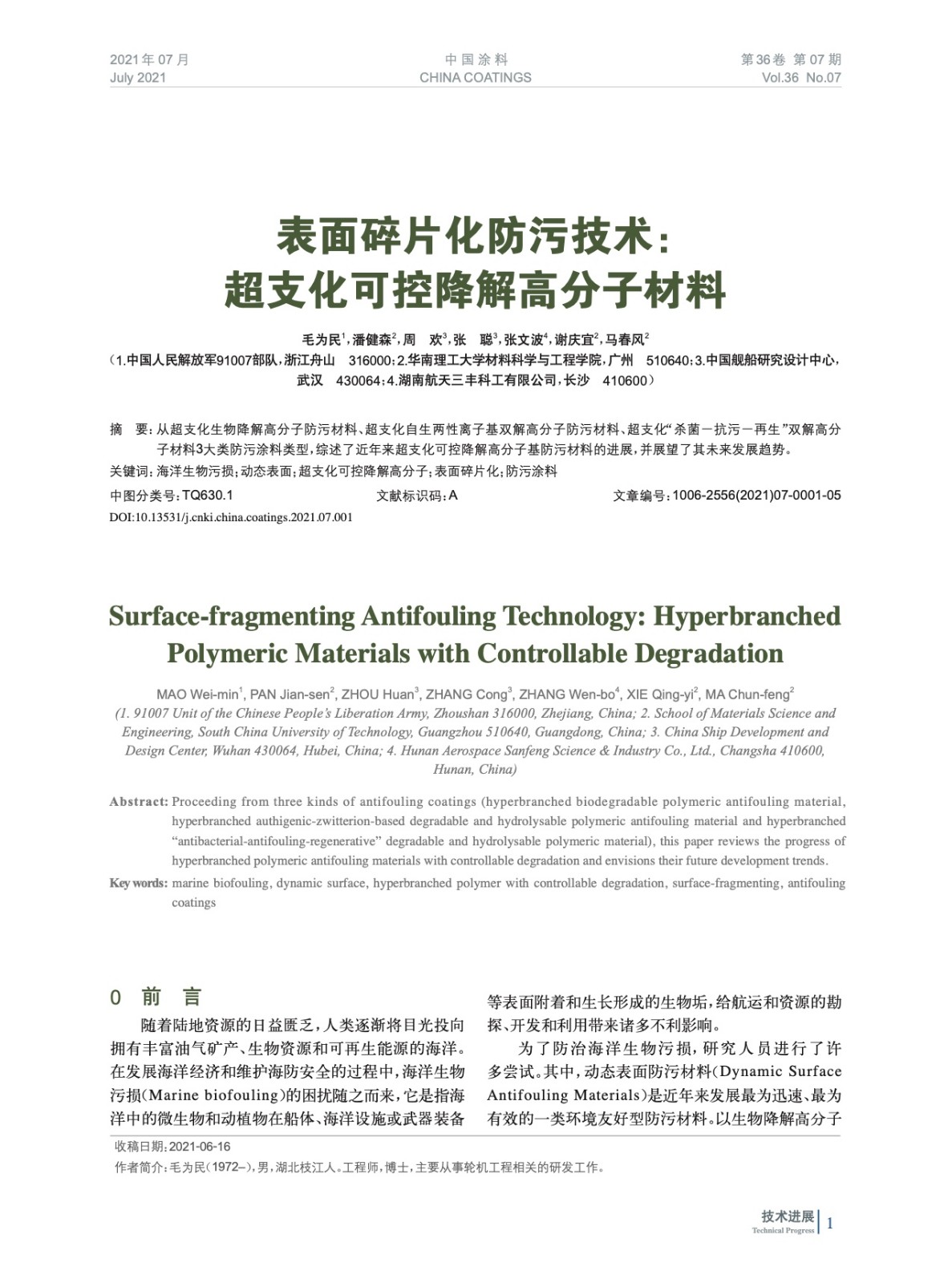 摘要:從超支化生物降解高分子防污材料、超支化自生兩性離子基雙解高分子防污材料、超支化“殺菌-抗污-再生”雙解高分子材料3大類防污涂料類型,綜述了近年來超支化可控降解高分子基防污材料的進展,并展望了其未來發展趨勢。