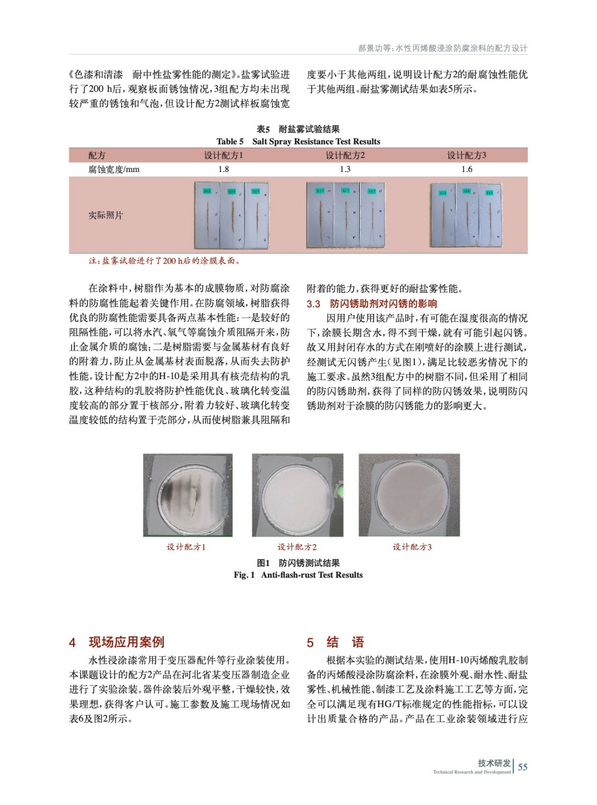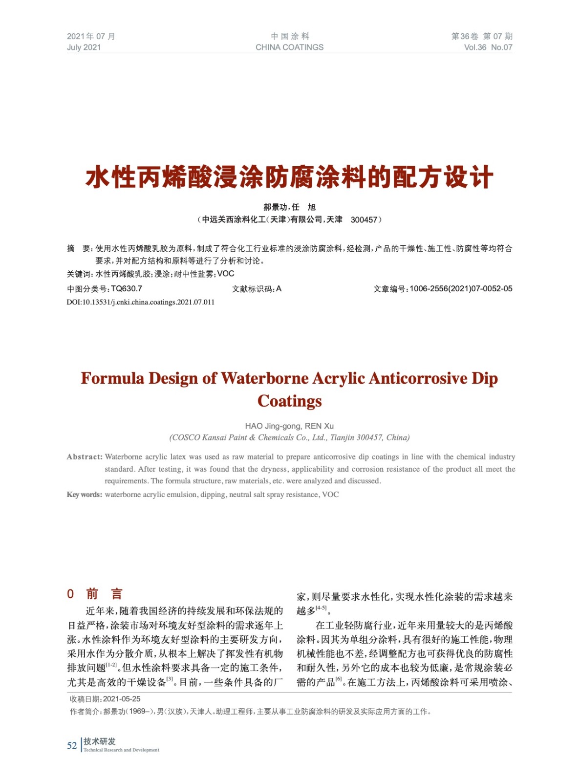 使用水性丙烯酸乳膠為原料,制成了符合化工行業標準的浸涂防腐涂料,經檢測,產品的干燥性、施工性、防腐性等均符合要求,并對配方結構和原料等進行了分析和討論。