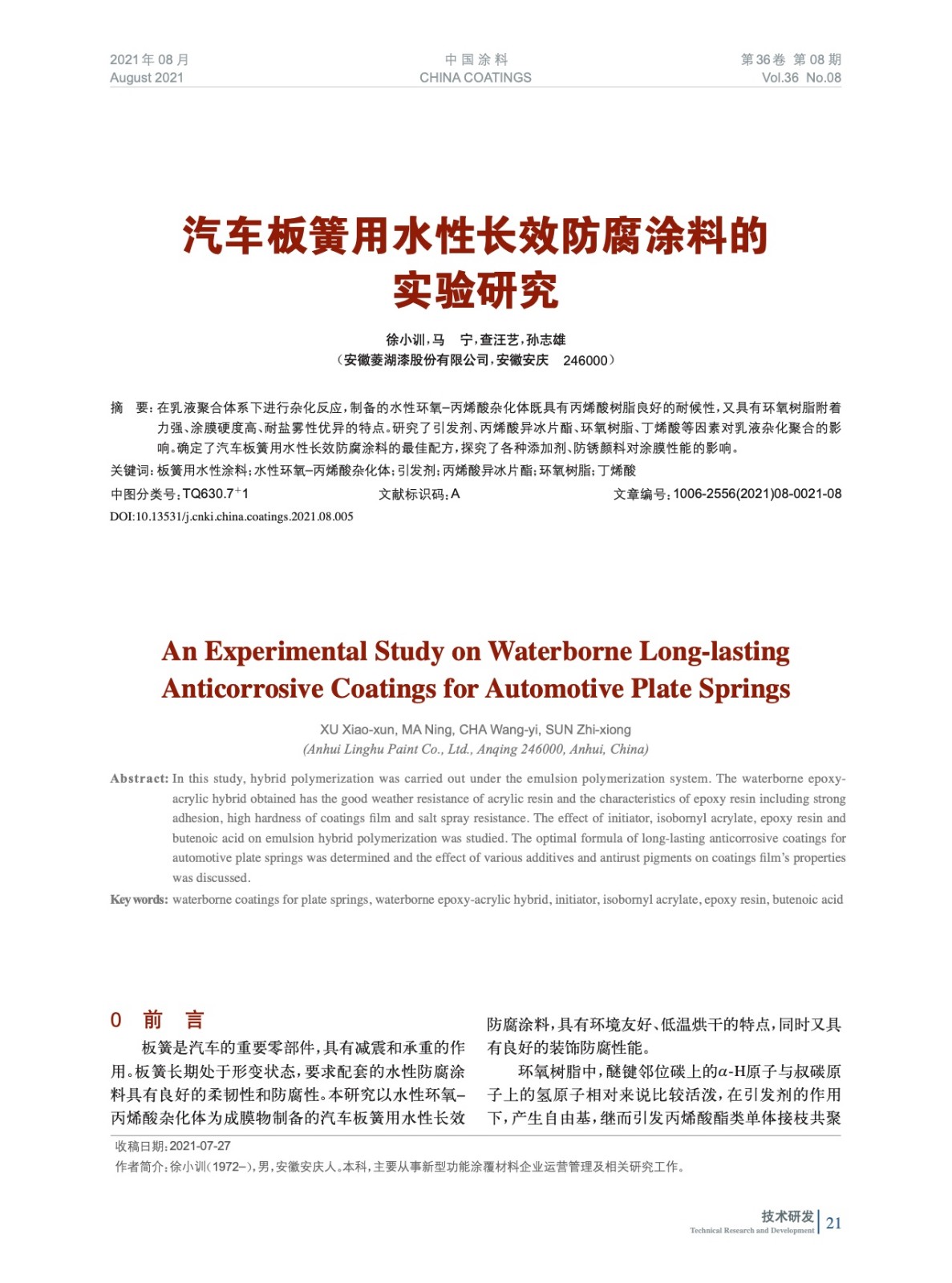 本文系作者@徐小訓(xùn),馬 寧,查汪藝,孫志雄 授權(quán)中國涂料網(wǎng)發(fā)表,并經(jīng)中國涂料網(wǎng)編輯,未經(jīng)允許不得轉(zhuǎn)載,如需轉(zhuǎn)載請聯(lián)系chinacoatingnet@vip.163.com