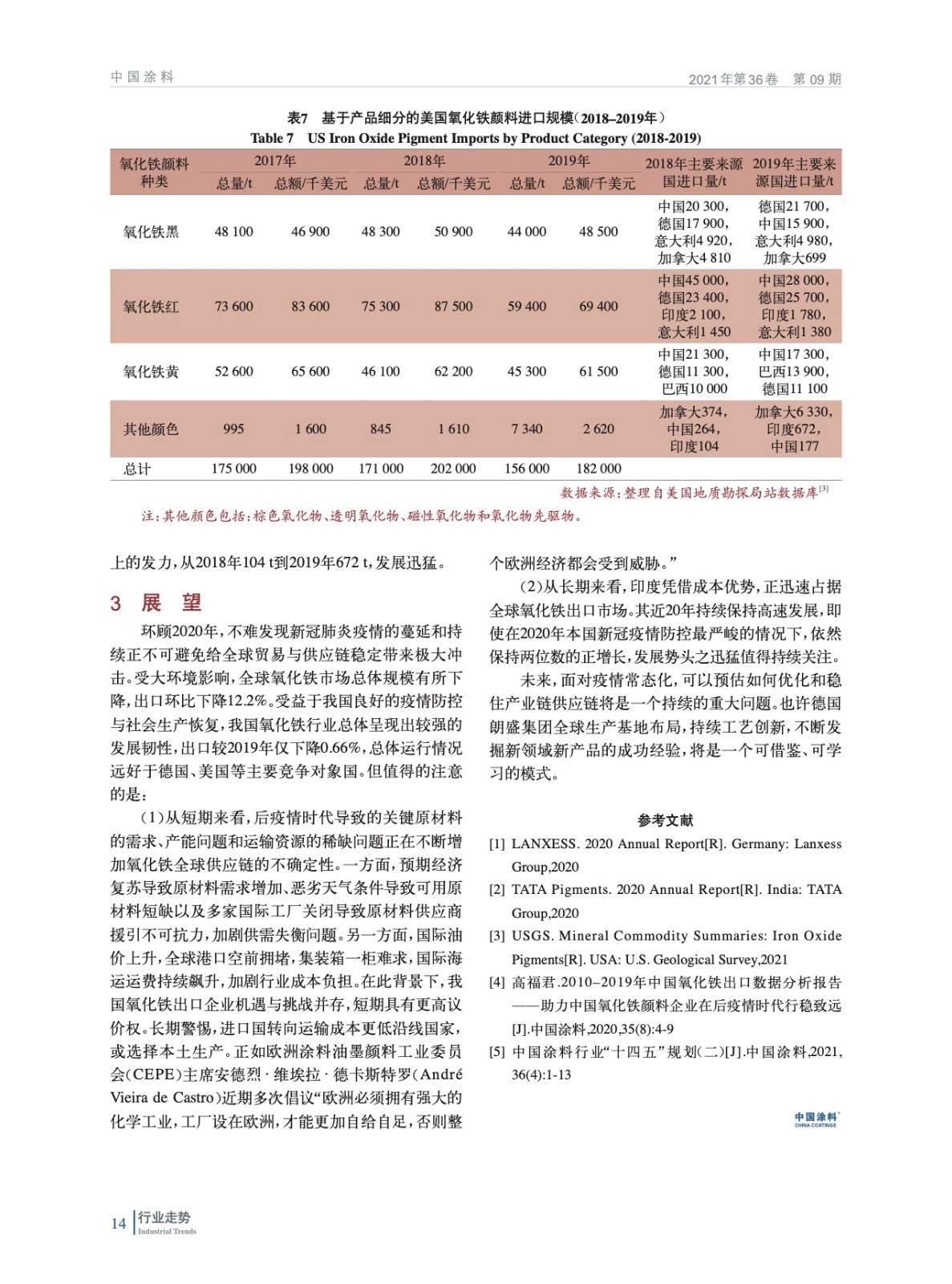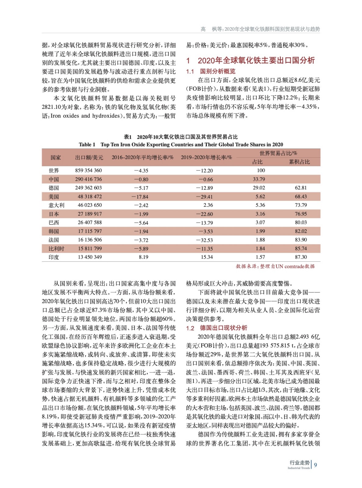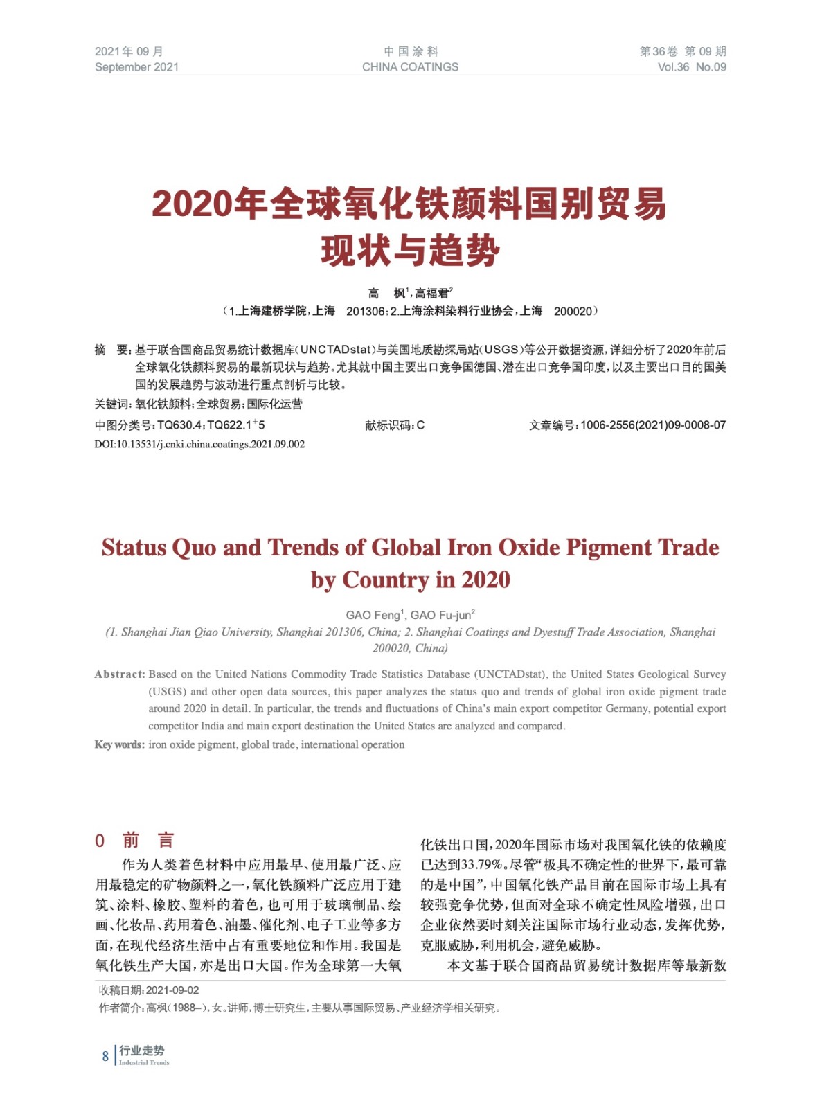 摘要:基于聯(lián)合國(guó)商品貿(mào)易統(tǒng)計(jì)數(shù)據(jù)庫(kù)(UNCTADstat)與美國(guó)地質(zhì)勘探局站(USGS)等公開(kāi)數(shù)據(jù)資源,詳細(xì)分析了2020年前后全球氧化鐵顏料貿(mào)易的最新現(xiàn)狀與趨勢(shì)。尤其就中國(guó)主要出口競(jìng)爭(zhēng)國(guó)德國(guó)、潛在出口競(jìng)爭(zhēng)國(guó)印度,以及主要出口目的國(guó)美國(guó)的發(fā)展趨勢(shì)與波動(dòng)進(jìn)行重點(diǎn)剖析與比較。