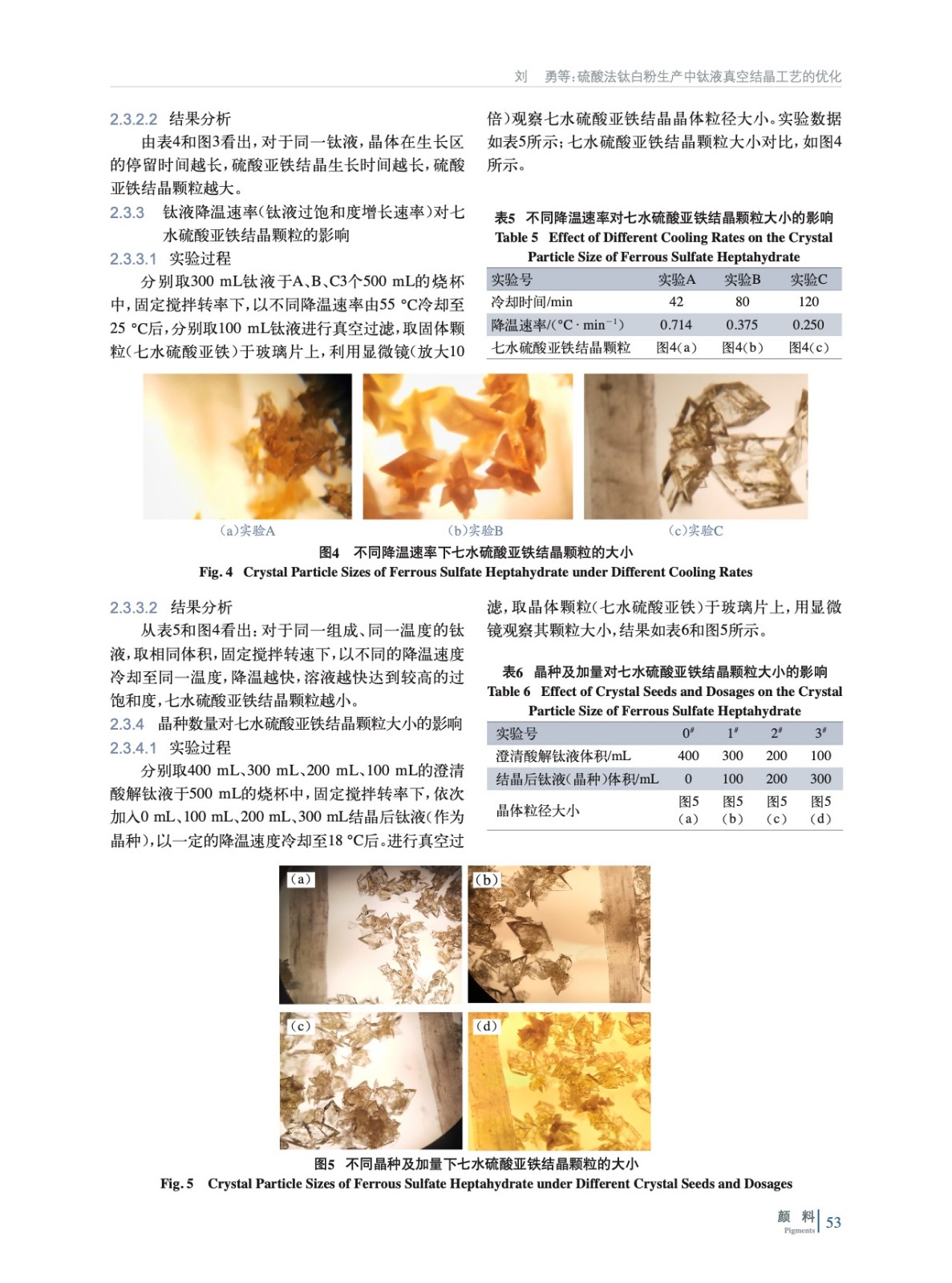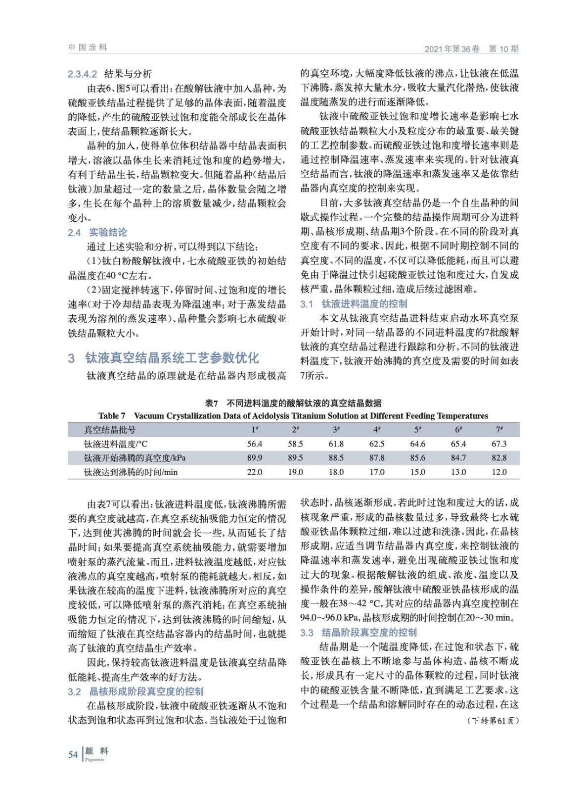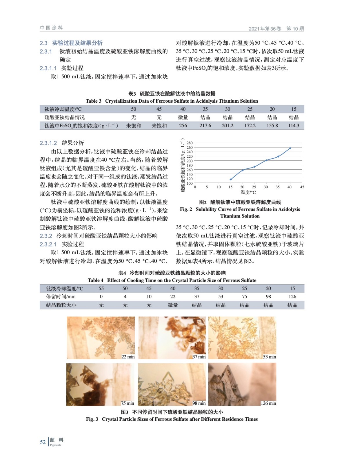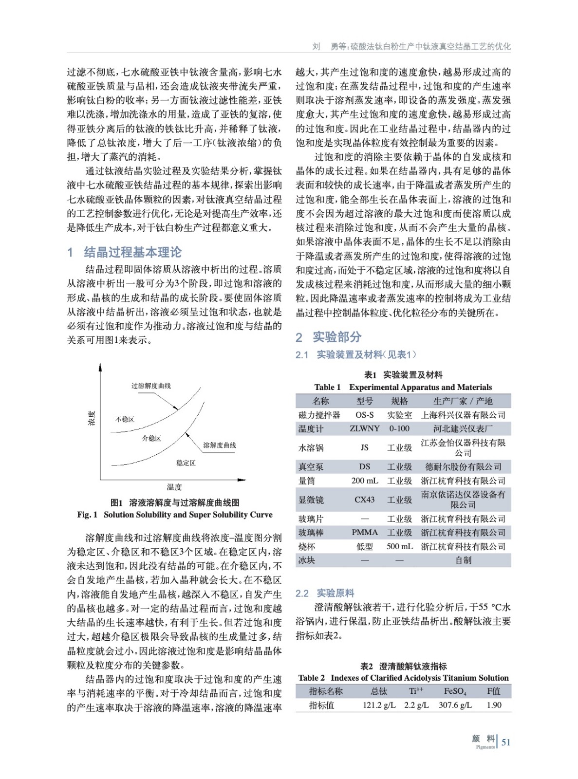 在硫酸法鈦白粉生產中,選取沉降澄清后的酸解鈦液,在一定攪拌速率下,實驗了影響七水硫酸亞鐵結晶顆粒大小的因素——停留時間、降溫速率、晶種及晶種加量,得到硫酸亞鐵在酸解鈦液中的溶解度曲線,并結合結晶原理對鈦液真空結晶過程工藝參數進行優化。