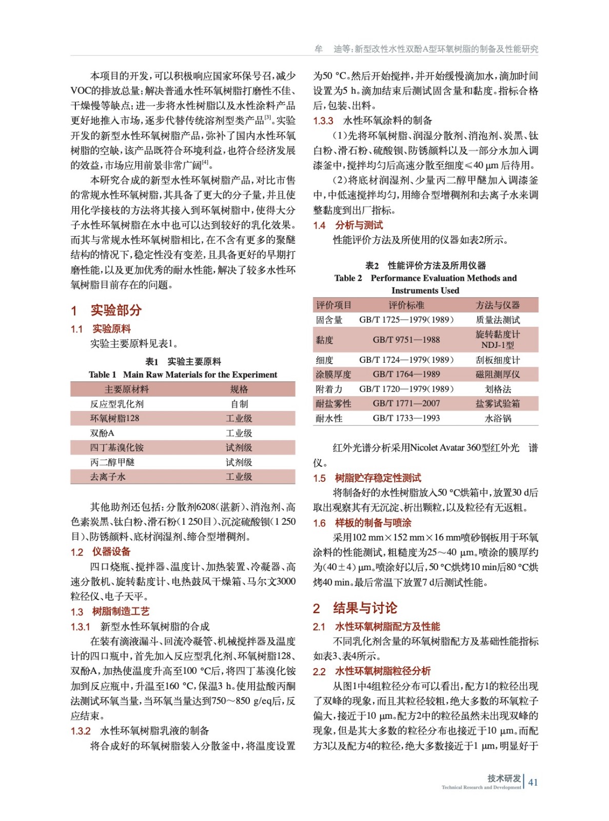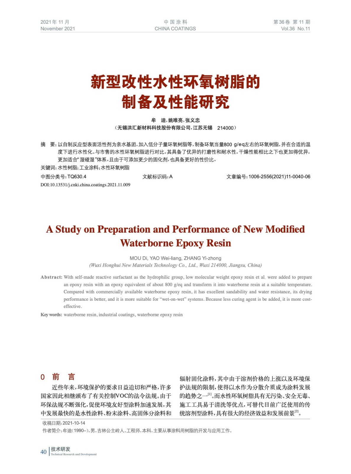 新型改性水性環氧樹脂的制備及性能研究
