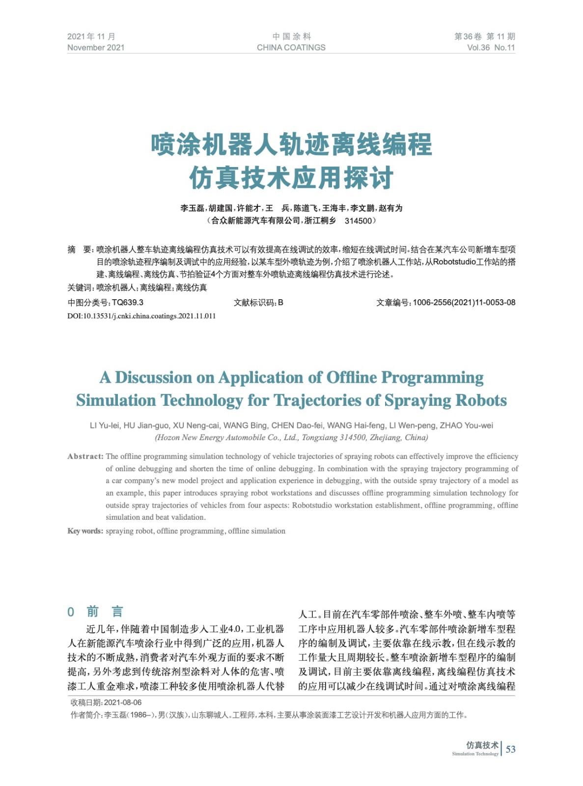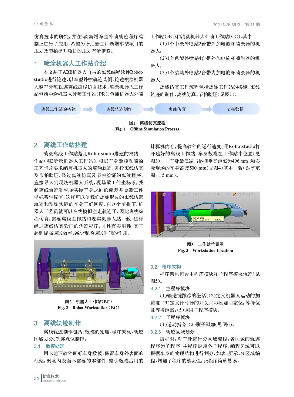 摘要:噴涂機器人整車軌跡離線編程仿真技術可以有效提高在線調試的效率,縮短在線調試時間。結合在某汽車公司新增車型項目的噴涂軌跡程序編制及調試中的應用經驗,以某車型外噴軌跡為例,介紹了噴涂機器人工作站,從Robotstudio工作站的搭建、離線編程、離線仿真、節拍驗證4個方面對整車外噴軌跡離線編程仿真技術進行論述。