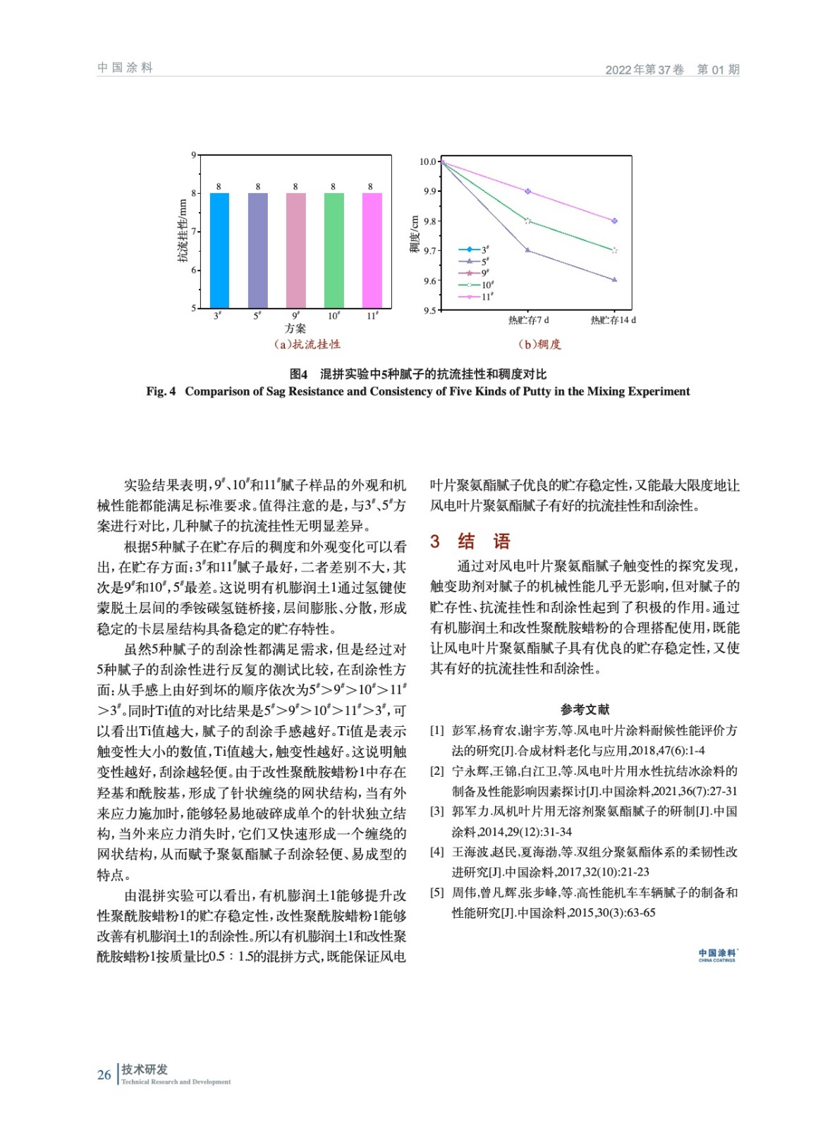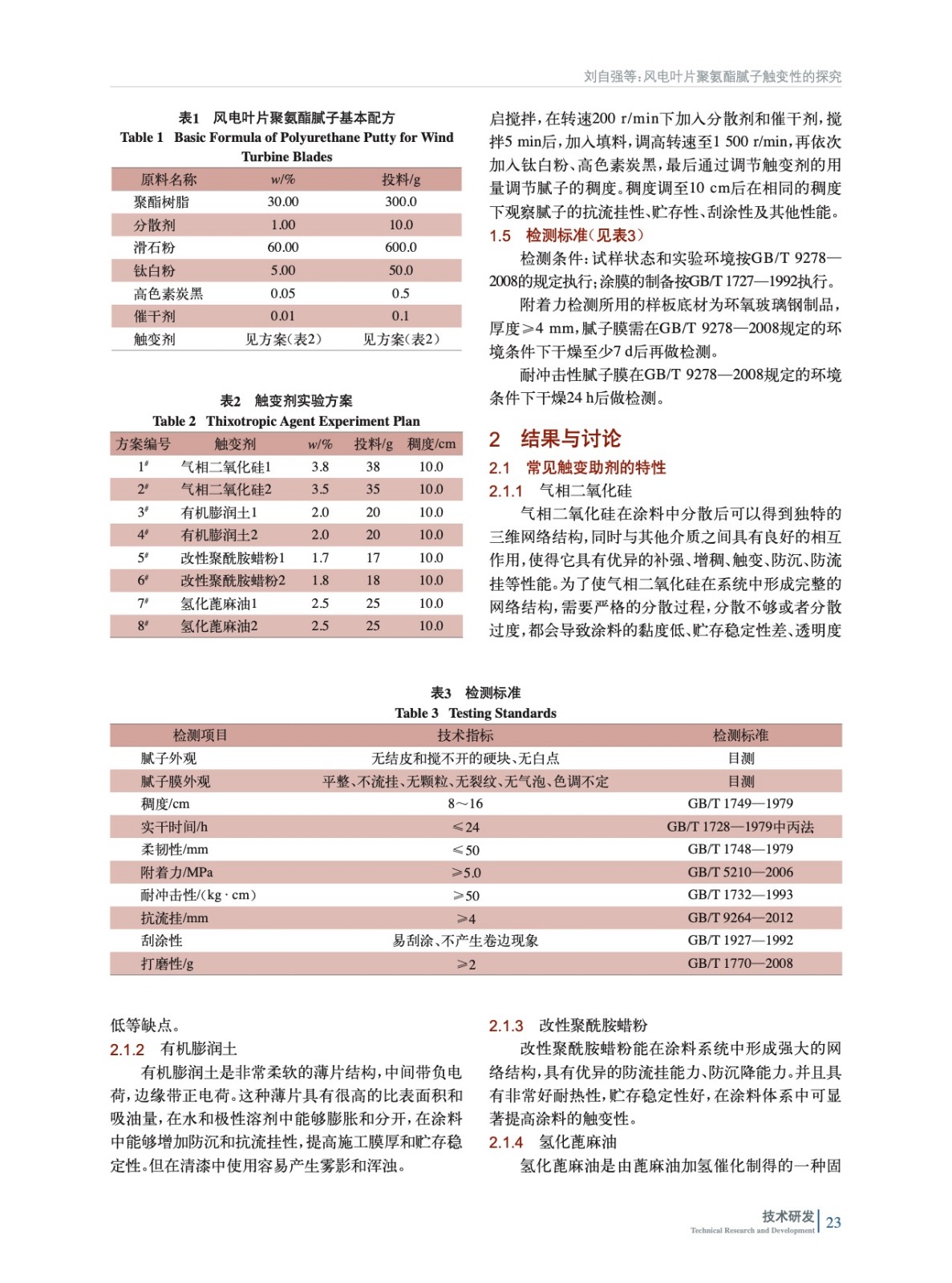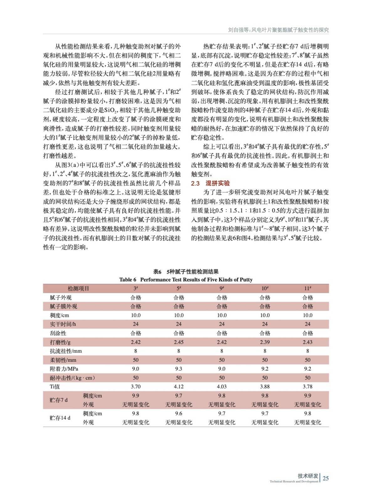 實驗通過多個角度對風電葉片膩子的觸變性進行了探究。測試結果表明,觸變助劑對膩子的機械性能幾乎無影響,通過有機膨潤土和改性聚酰胺蠟粉的合理搭配使用,既能讓風電葉片聚氨酯膩子具有優良的貯存穩定性,又使其有好的抗流掛性和刮涂性。