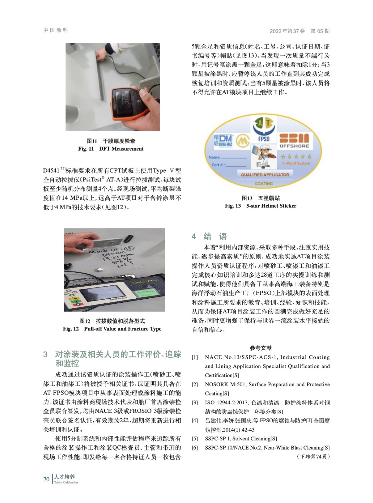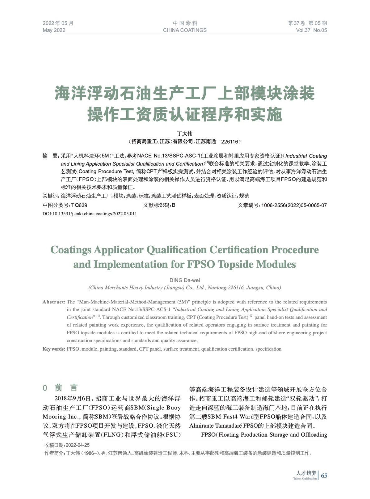 摘要:采用“人機料法環(huán)(5M)”工法,參考NACE No.13/SSPC-ASC-1《工業(yè)涂層和襯里應用專家資格認證》聯(lián)合標準的相關要求,通過定制化的課堂教學、涂裝工藝測試樣板實操測試,并結合對相關涂裝工作經(jīng)驗的評估,對從事海洋浮動石油生產(chǎn)工廠(FPSO)上部模塊的表面處理和涂裝的相關操作人員進行資格認證,用以滿足高端海工項目FPSO的建造規(guī)范和標準的相關技術要求和質量保證。