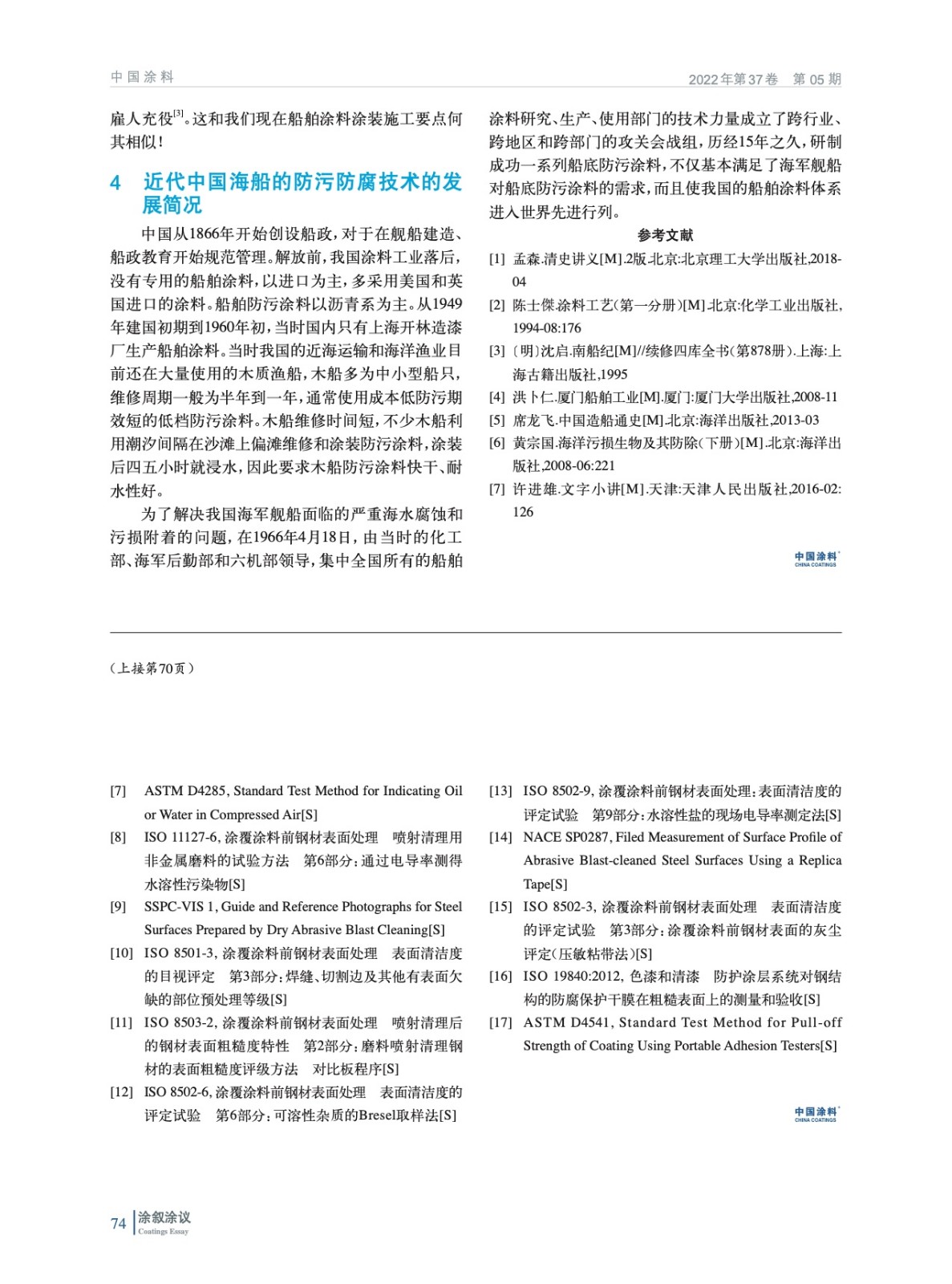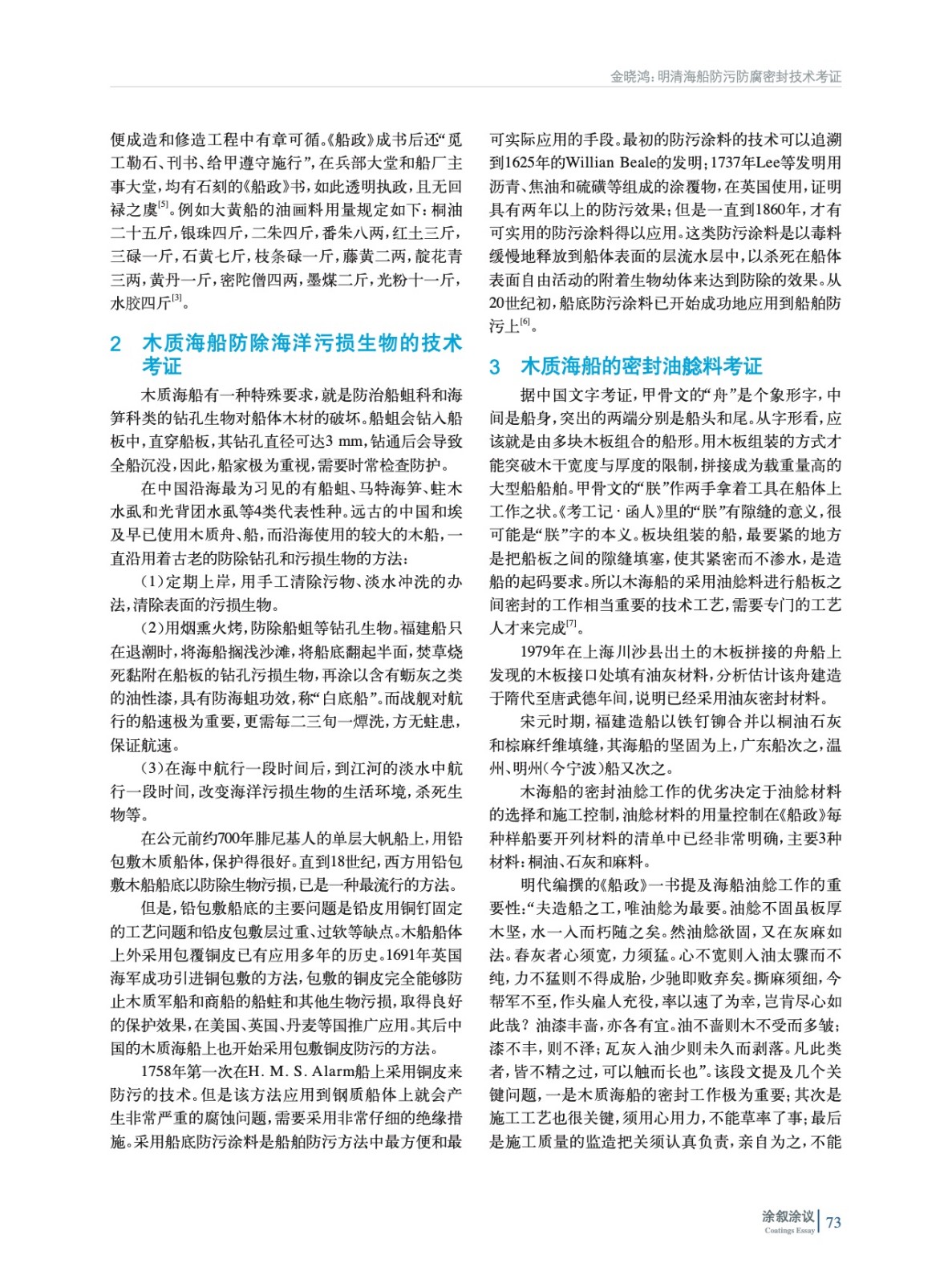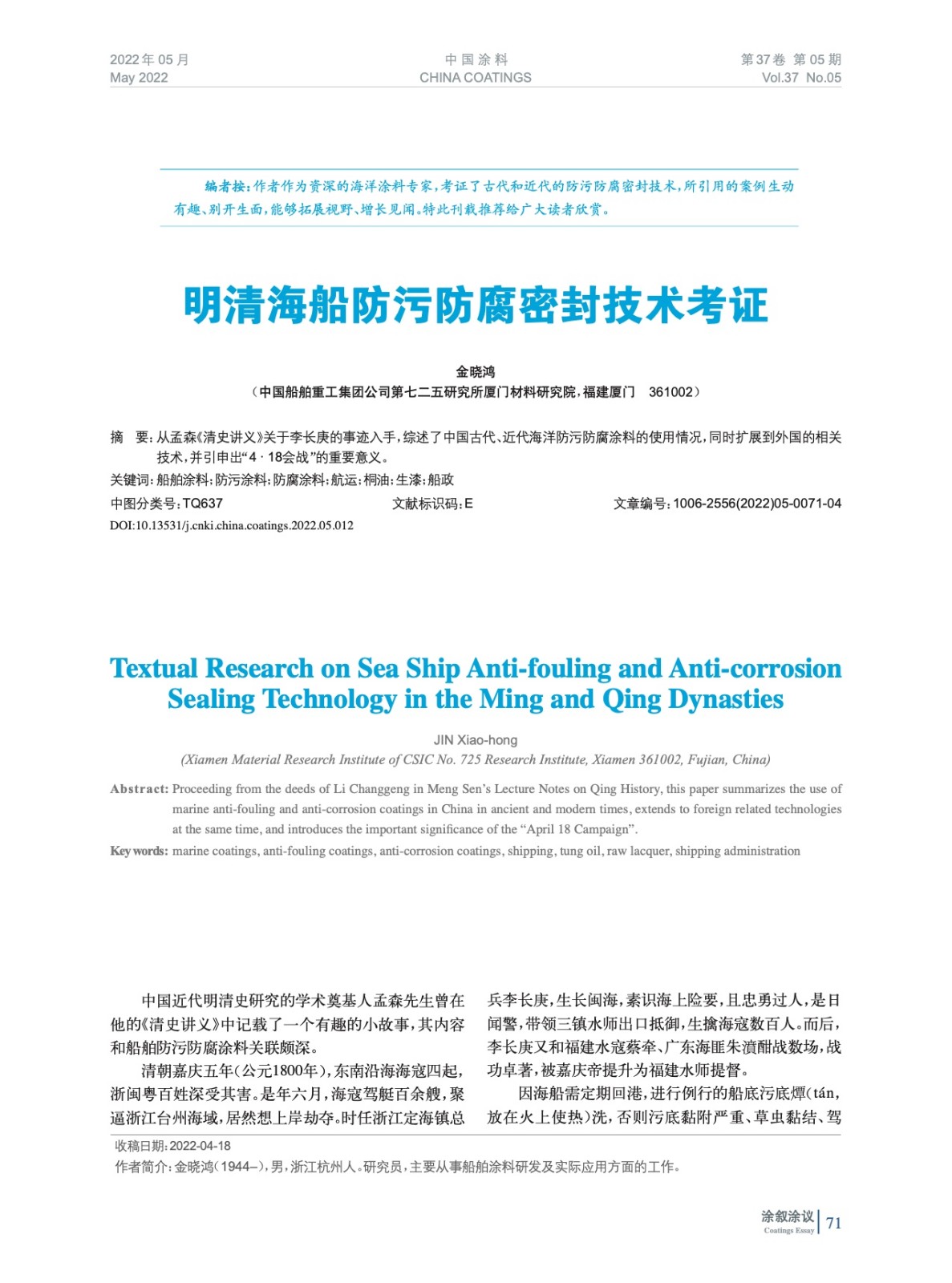 摘要:從孟森《清史講義》關(guān)于李長庚的事跡入手,綜述了中國古代、近代海洋防污防腐涂料的使用情況,同時(shí)擴(kuò)展到外國的相關(guān)技術(shù),并引申出“4·18會(huì)戰(zhàn)”的重要意義。