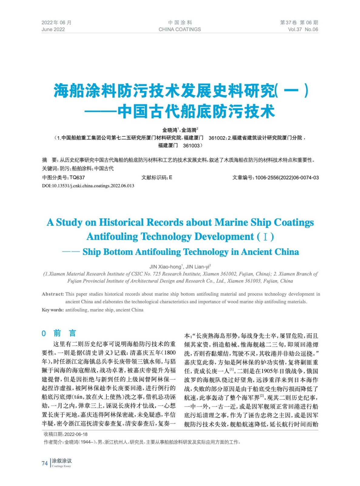 從歷史紀事研究中國古代海船的船底防污材料和工藝的技術發展史料,敘述了木質海船在防污的材料技術特點和重要性。