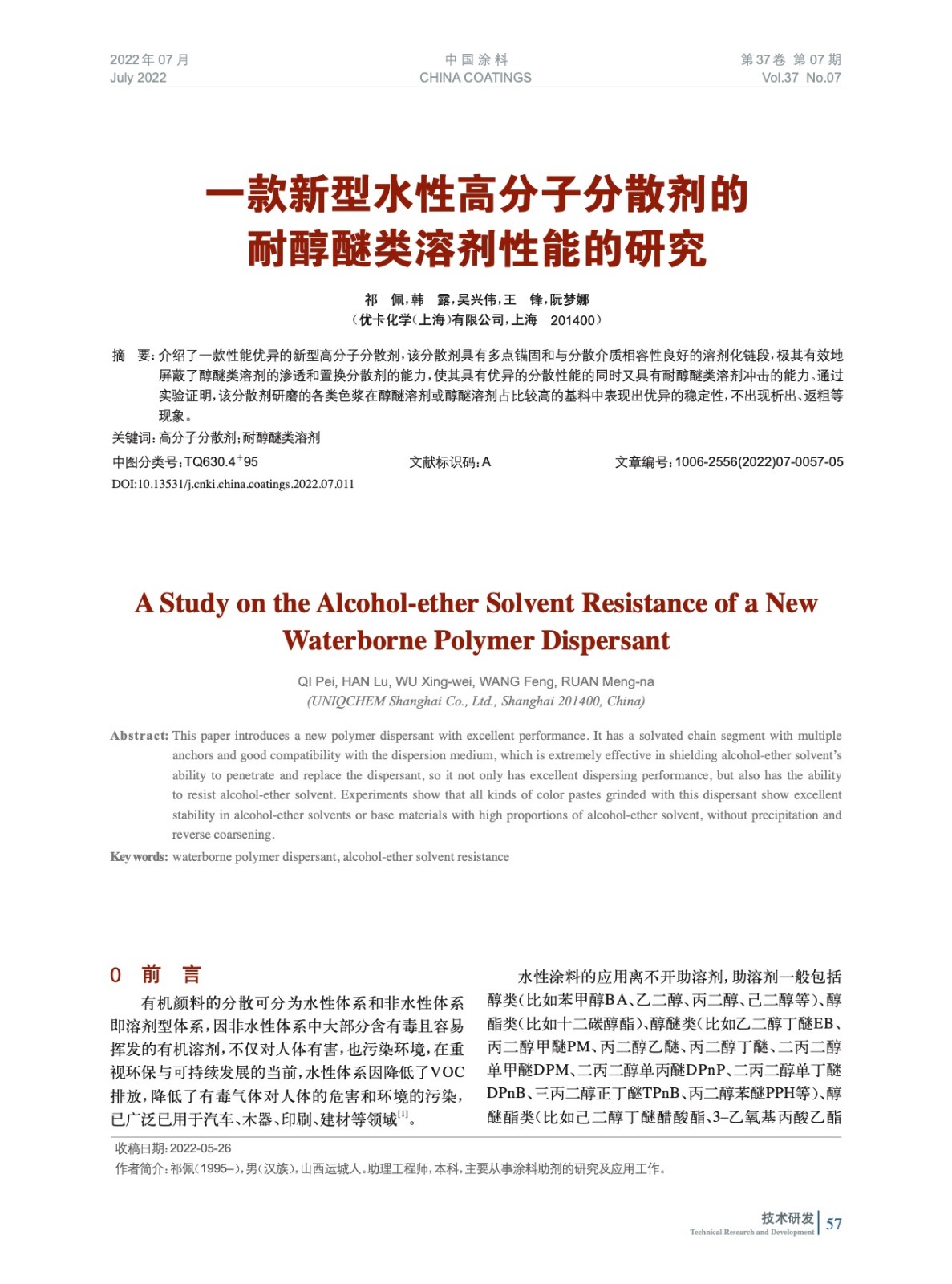 一款新型水性高分子分散劑的耐醇醚類溶劑性能的研究