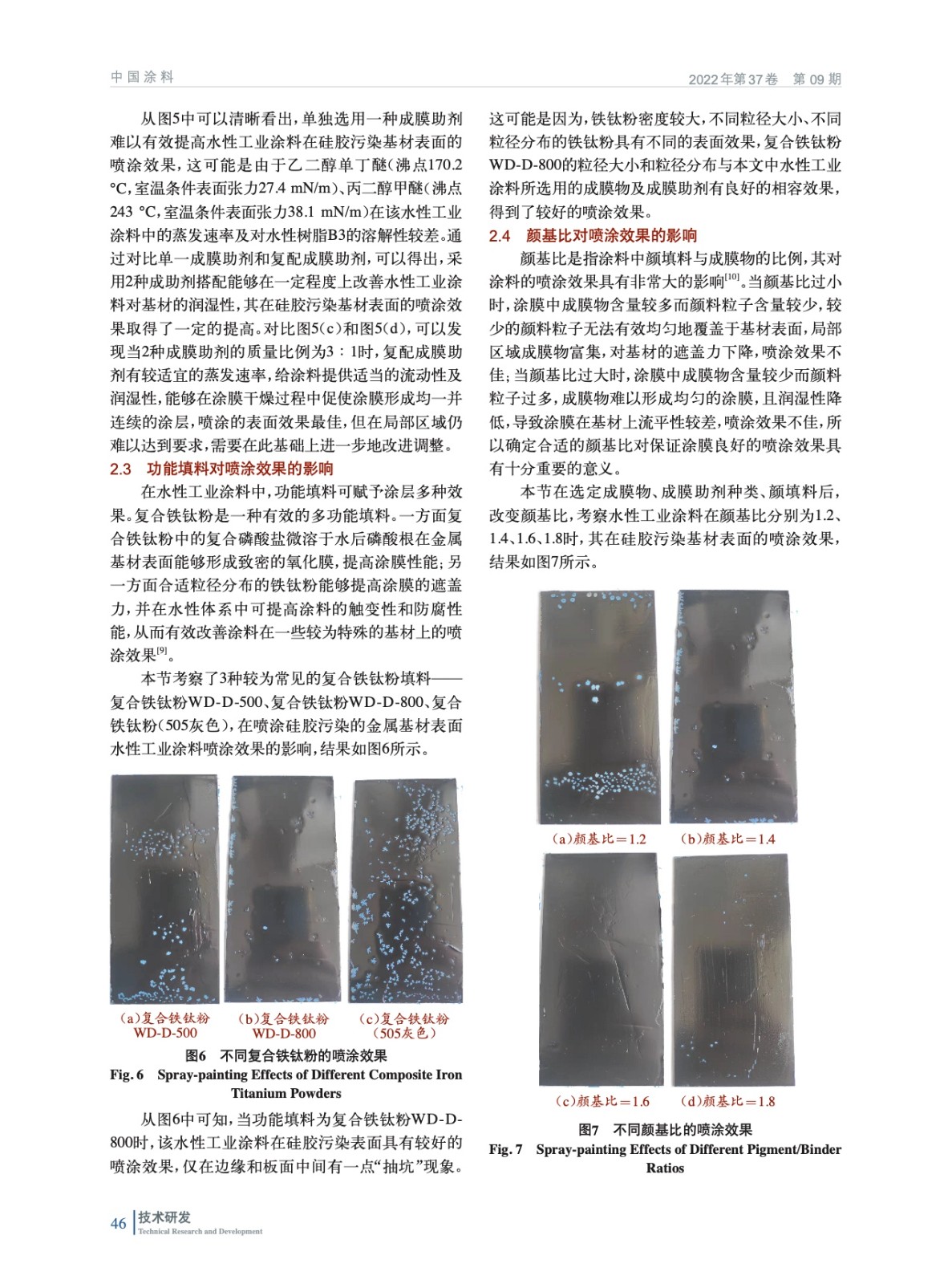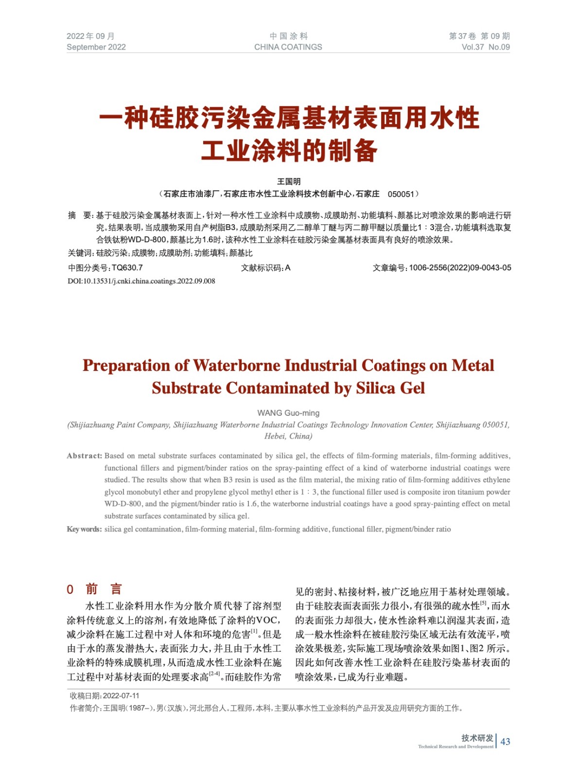 摘要:基于硅膠污染金屬基材表面上,針對一種水性工業涂料中成膜物、成膜助劑、功能填料、顏基比對噴涂效果的影響進行研究。結果表明,當成膜物采用自產樹脂B3,成膜助劑采用乙二醇單丁醚與丙二醇甲醚以質量比1∶3混合,功能填料選取復合鐵鈦粉WD-D-800,顏基比為1.6時,該種水性工業涂料在硅膠污染金屬基材表面具有良好的噴涂效果。