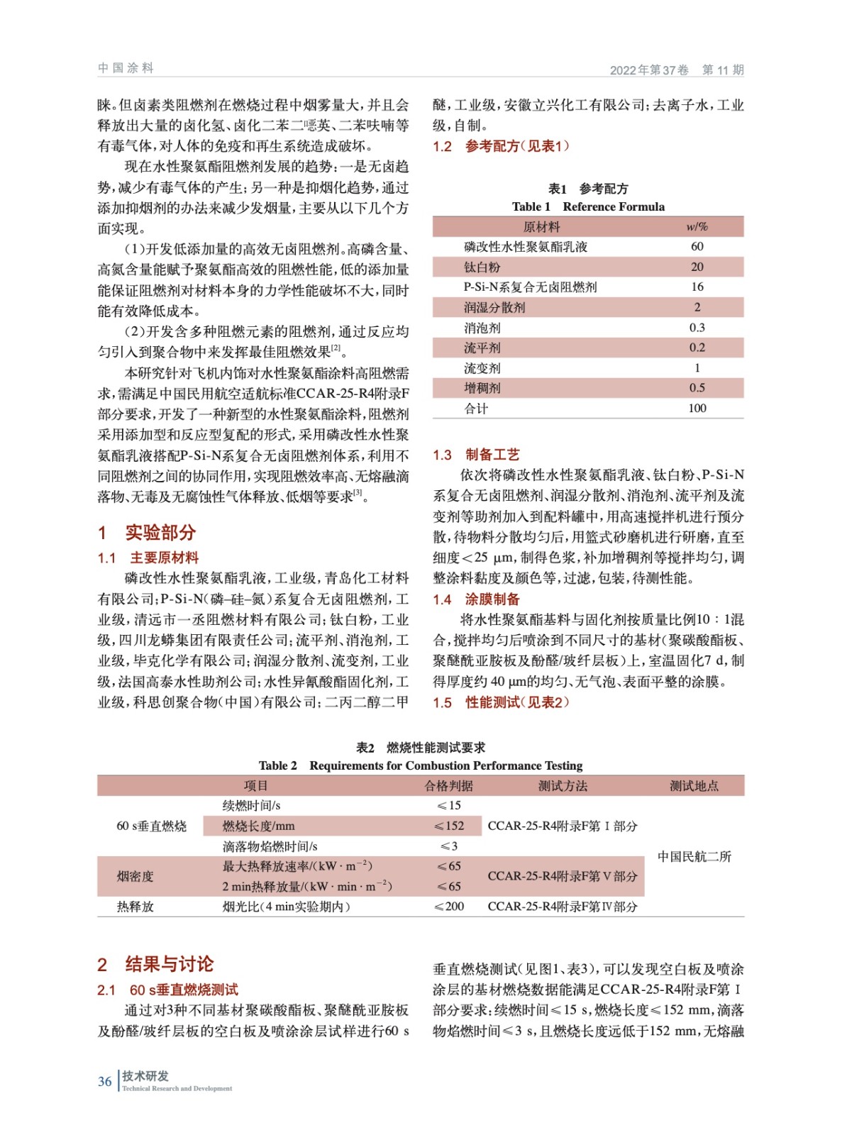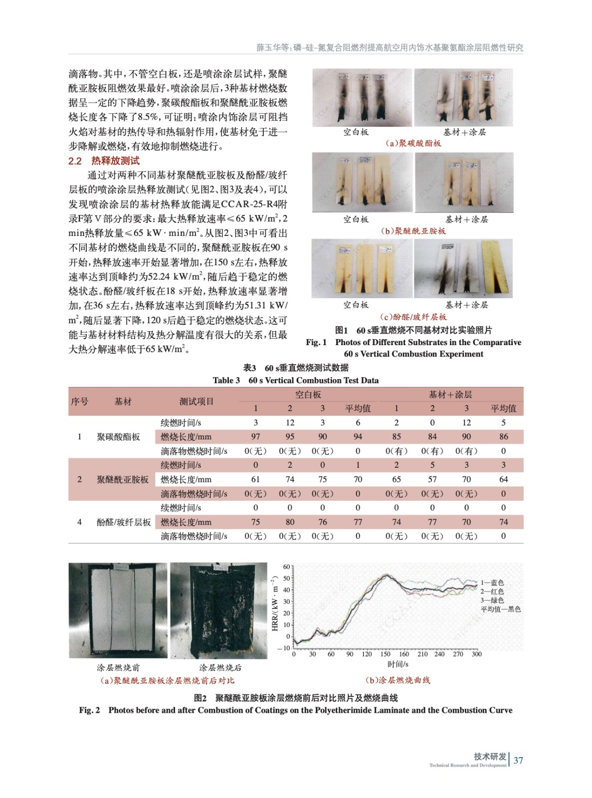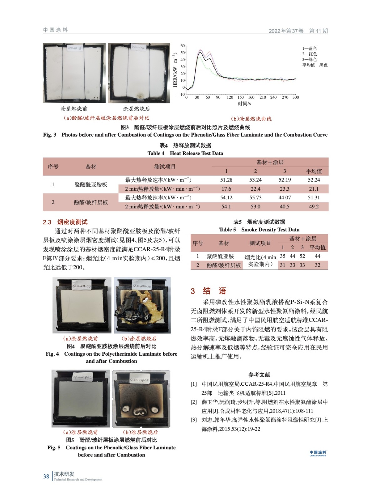摘要:針對飛機(jī)內(nèi)飾對水性聚氨酯涂層高阻燃要求,采用磷改性水性聚氨酯乳液搭配P-Si-N(磷–硅–氮)系復(fù)合無鹵阻燃劑體系開發(fā)了新型高阻燃水性聚氨酯涂層,涂覆在聚碳酸酯板、聚醚酰亞胺及酚醛/玻纖層板3種基材上,與空白板進(jìn)行燃燒對比實(shí)驗(yàn),測試結(jié)果達(dá)到了《中國民用航空規(guī)章 第25部 運(yùn)輸類飛機(jī)適航標(biāo)準(zhǔn)》[CCAR-25-R4]附錄F部分關(guān)于內(nèi)飾阻燃的要求,涂層具有阻燃效率高、無熔融滴落物、無毒及無腐蝕性氣體釋放、低煙等特點(diǎn),經(jīng)驗(yàn)證可完全應(yīng)用在航空內(nèi)飾上推廣使用。