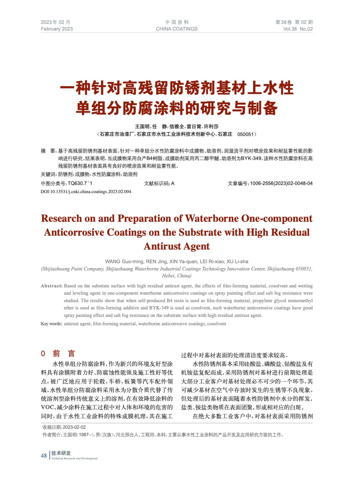 一種針對高殘留防銹劑基材上水性單組分防腐涂料的研究與制備