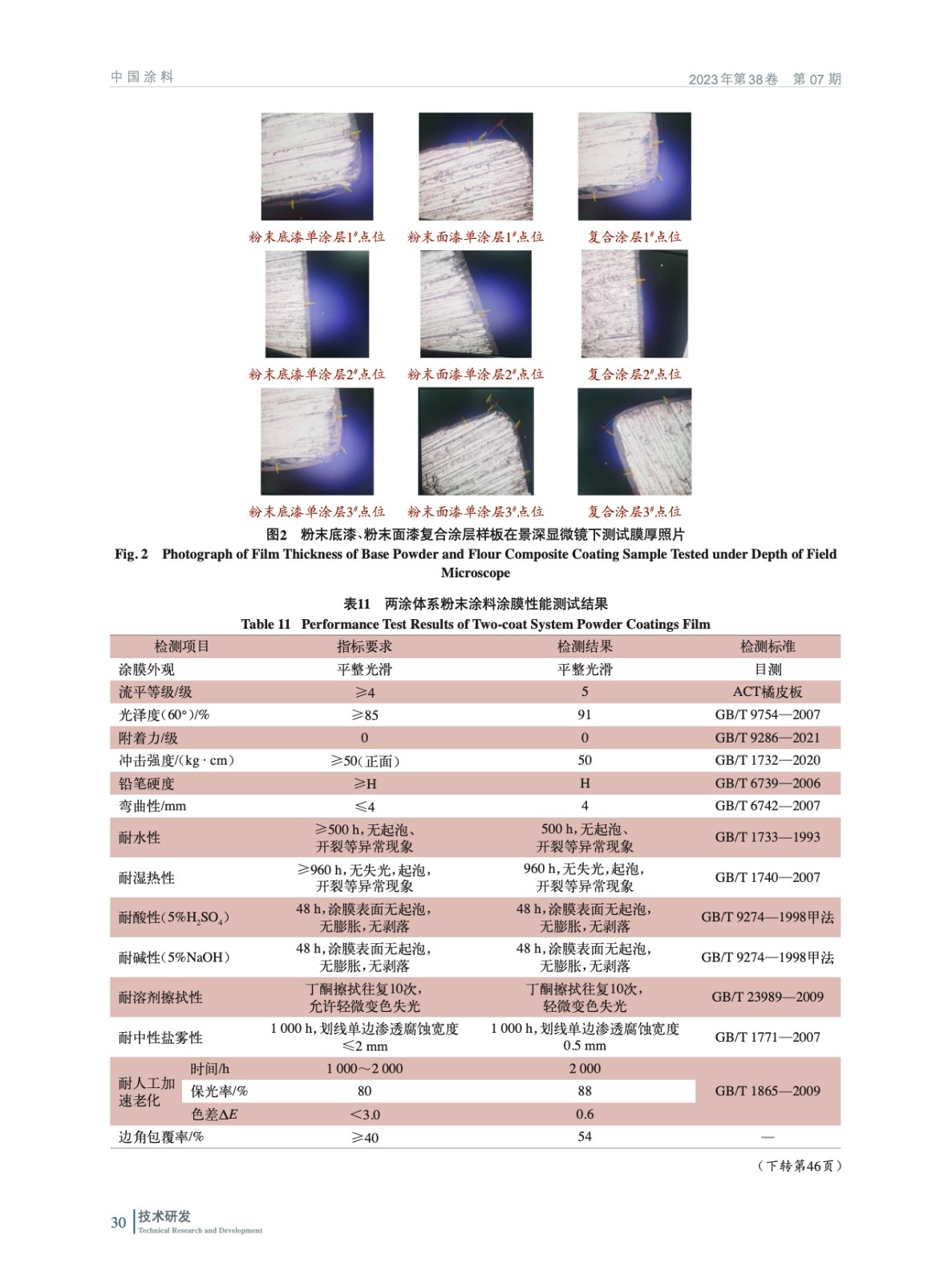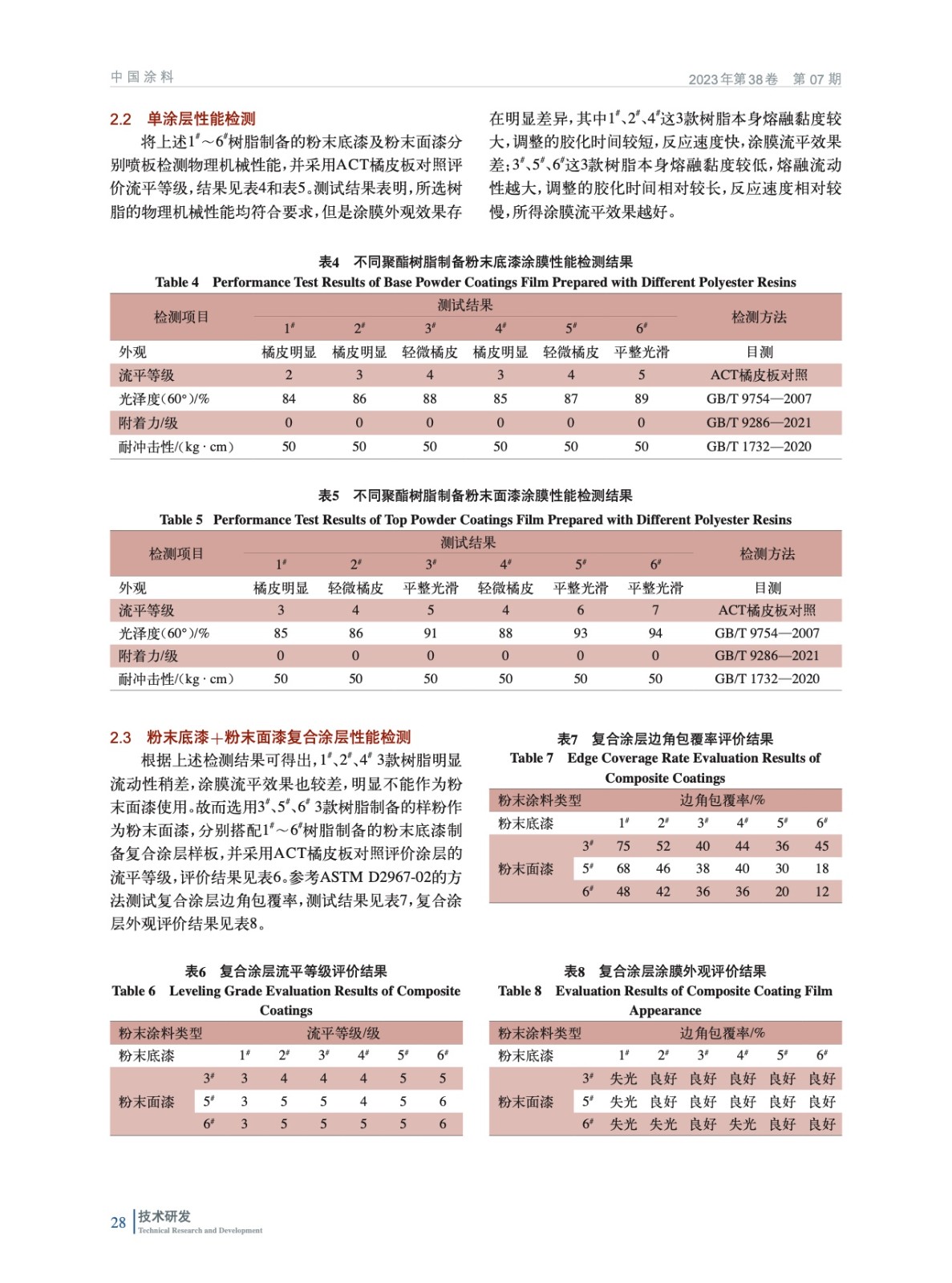摘要:通過對比研究聚酯樹脂的黏度以及邊角覆蓋助劑對涂膜流平性和邊角包覆效果的影響,并通過調(diào)整粉末涂料膠化時間,制備出一種兩涂體系粉末涂料。結(jié)果表明,采用高黏度樹脂制備粉末底漆搭配采用低黏度樹脂制備的粉末面漆,并將粉末底漆和粉末面漆分別調(diào)整到合適的膠化時間,達(dá)到相容性的平衡,所得復(fù)合涂層涂膜邊角包覆性好,同時具備優(yōu)異的裝飾性和保護(hù)性。