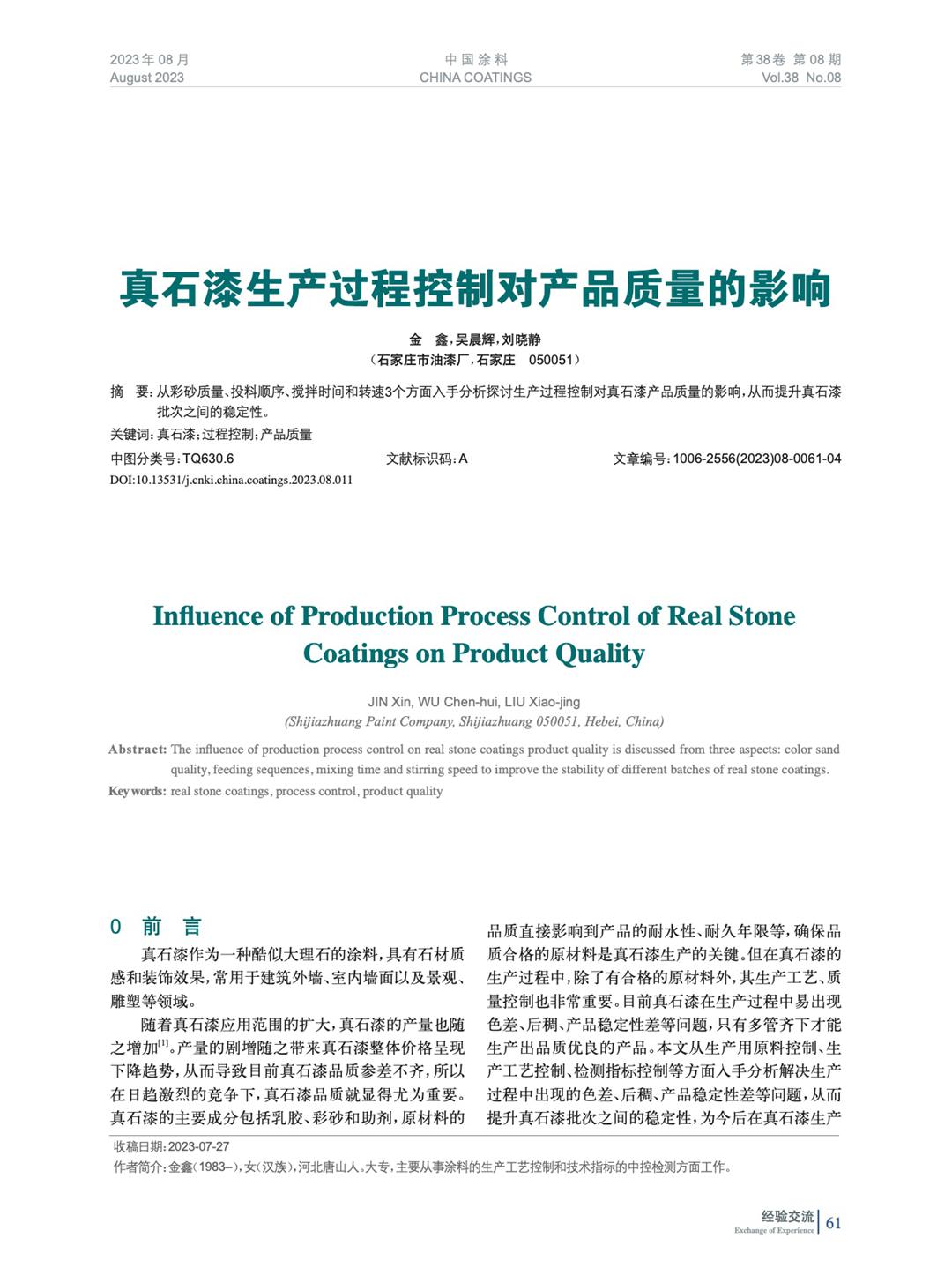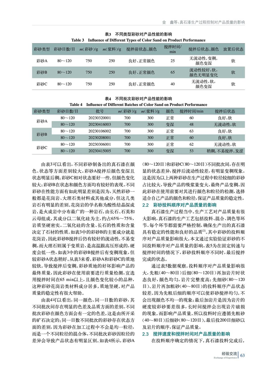 從彩砂質量、投料順序、攪拌時間和轉速3個方面入手分析探討生產過程控制對真石漆產品質量的影響,從而提升真石漆批次之間的穩定性。