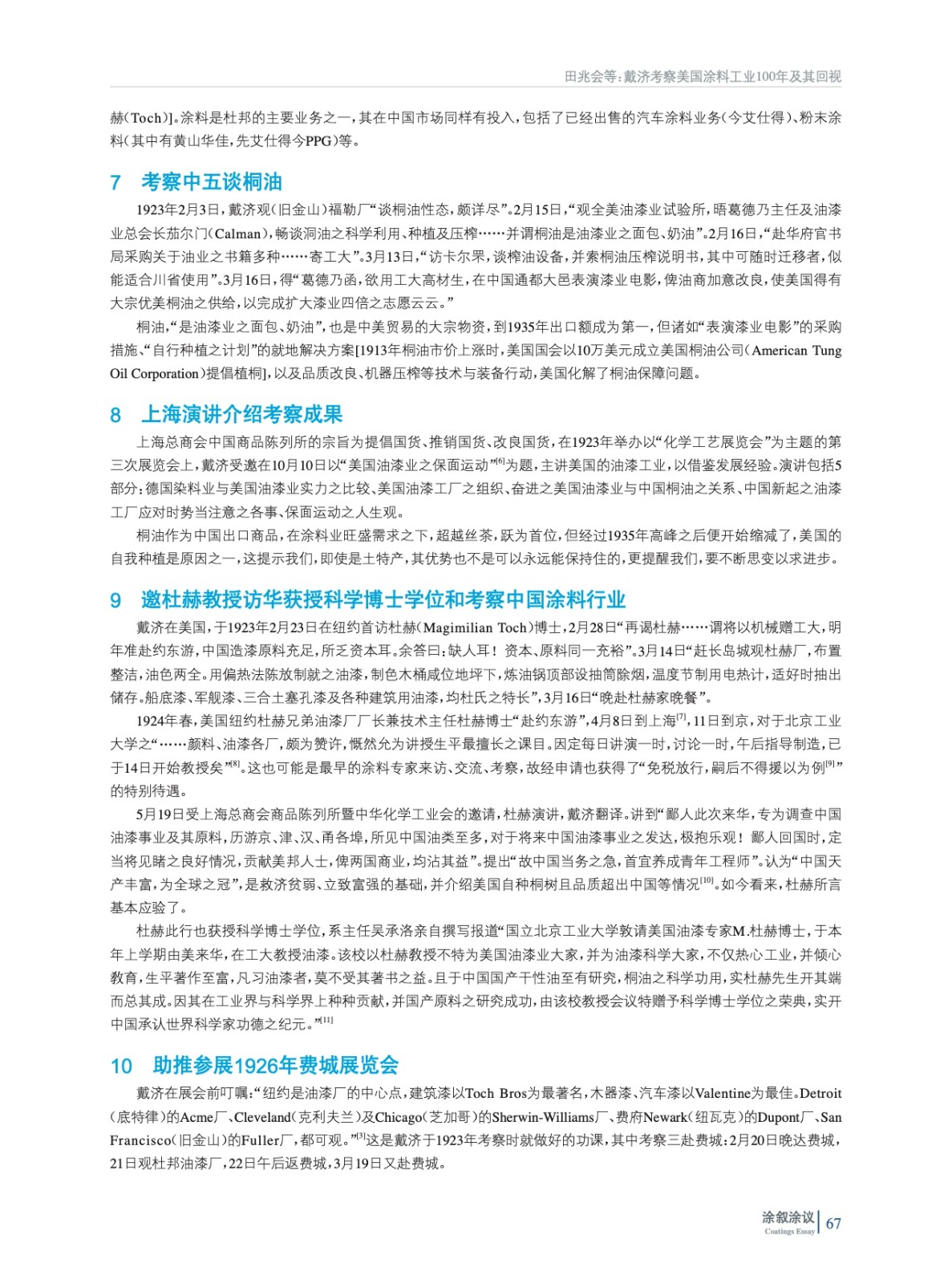 摘要:100年前的1923年,戴濟(字汝楫)考察美國涂料業,時間跨度為1月31日至4月13日,歷時73天,主要沿舊金山–紐約一線,參觀至少34家工廠、13處公共機構,會晤37人,并寫成《游美紀程》一文,收錄在《油漆季刊(費府賽會號)》中,在10月10日于上海總商會商品陳列所第三次展覽會暨化學工藝展覽會(1923年)上,發表題為“美國油漆業之保面運動”的演講,促成杜赫于1924年來華“專為調查中國油漆事業及其原料”,也由此開啟和奠定中美涂料業的相互交流的基礎。當初這第一步走出去之時,正值我國從原始大漆、桐油開始轉型、現代涂料工業起步之際。此行作為中國涂料發展歷程的一個標志性和重大活動,本應是值得紀念的,由此再提和回視百年前的考察,也更應有其價值和意義。