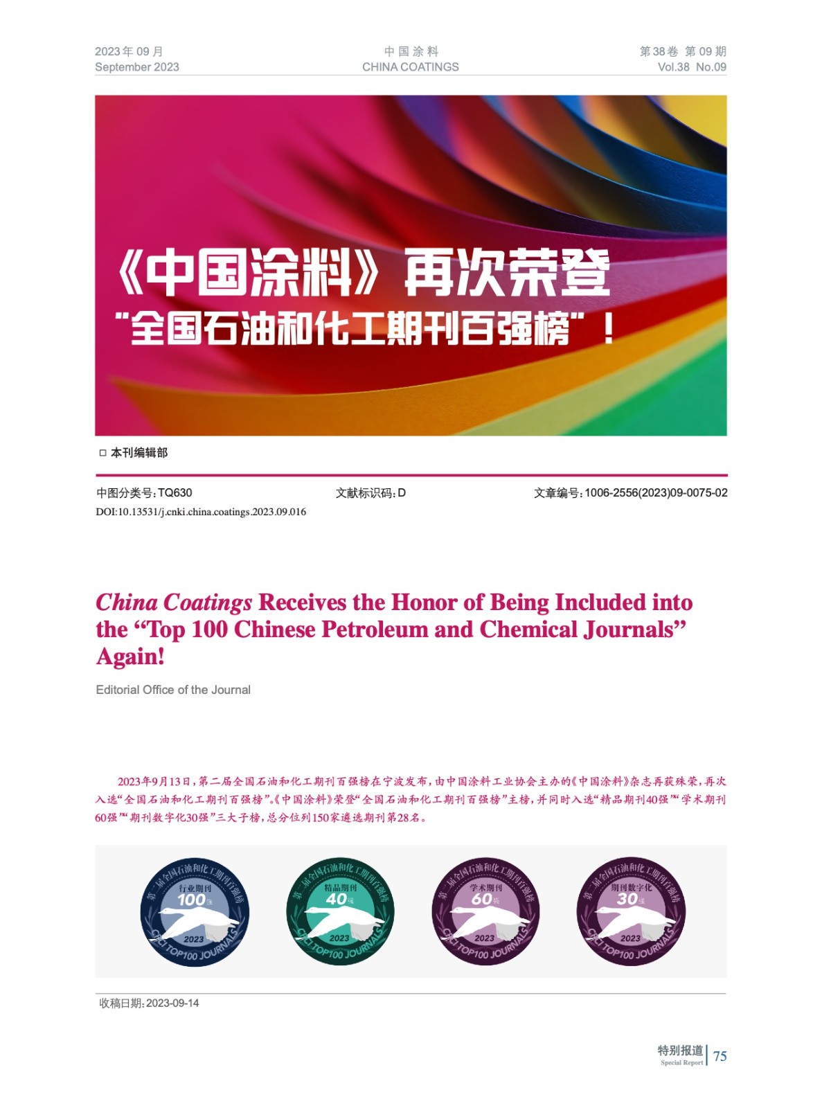 《中國涂料》再次榮登“全國石油和化工期刊百強榜”!