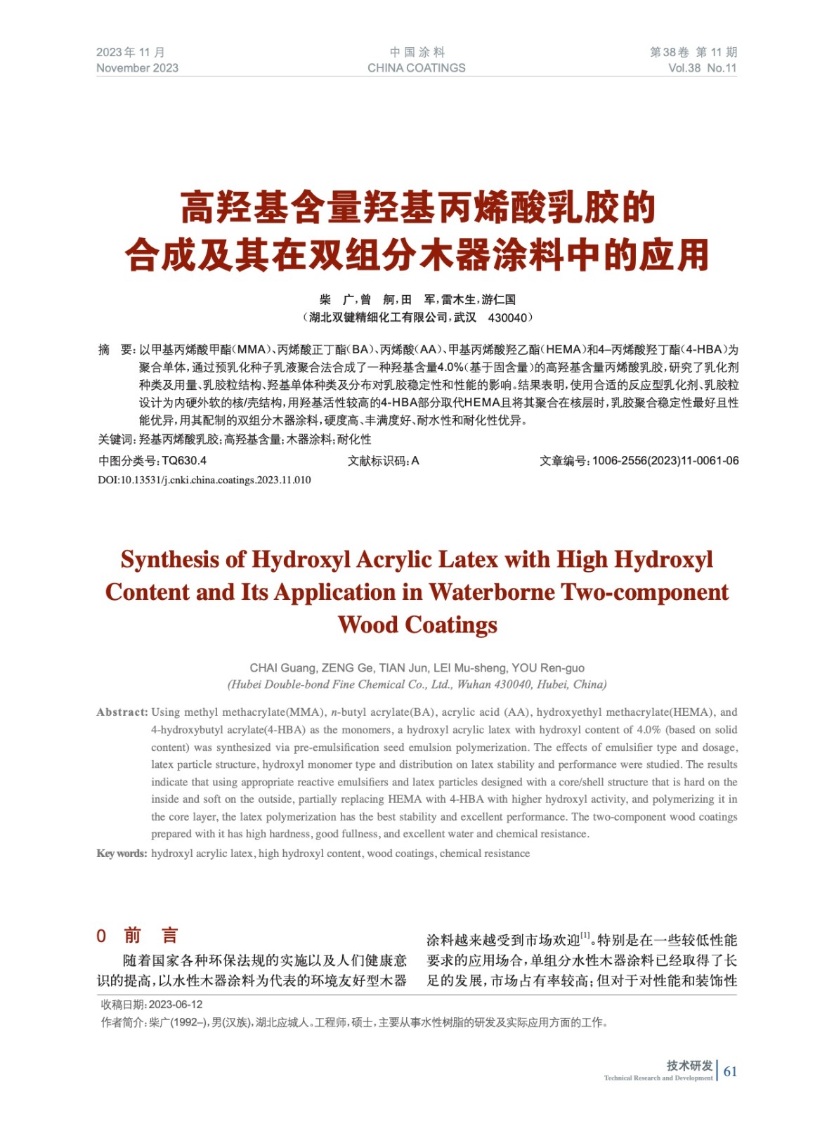高羥基含量羥基丙烯酸乳膠的合成及其在雙組分木器涂料中的應用