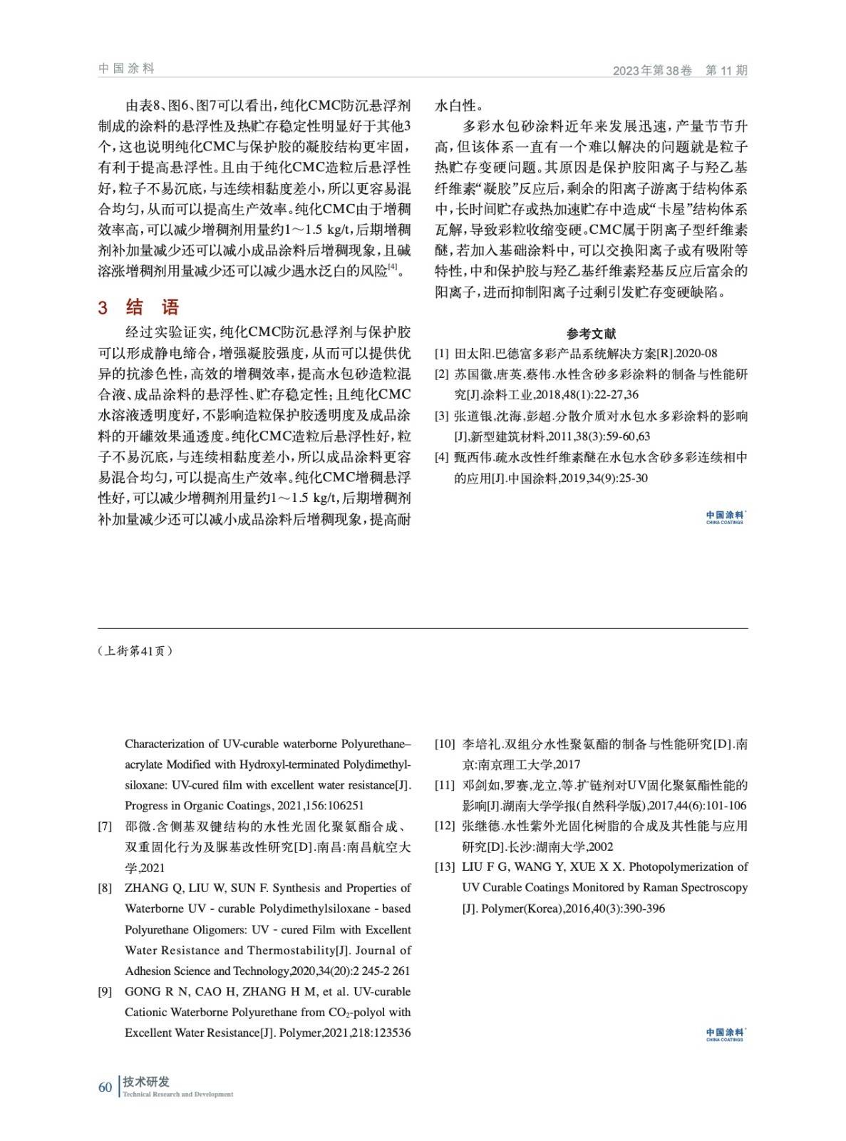 摘要:通過測試不同種類的防沉懸浮劑水溶液的耐水白性、防沉懸浮劑在造粒保護膠中的增稠效果、基礎(chǔ)涂料尤其是深色基礎(chǔ)涂料加入造粒保護膠后的抗?jié)B色性及防沉懸浮性、成品涂料的加速貯存穩(wěn)定性等,優(yōu)選出了純化改性CMC作為水包砂多彩涂料的助劑時,產(chǎn)品的防沉劑懸浮性最優(yōu)。