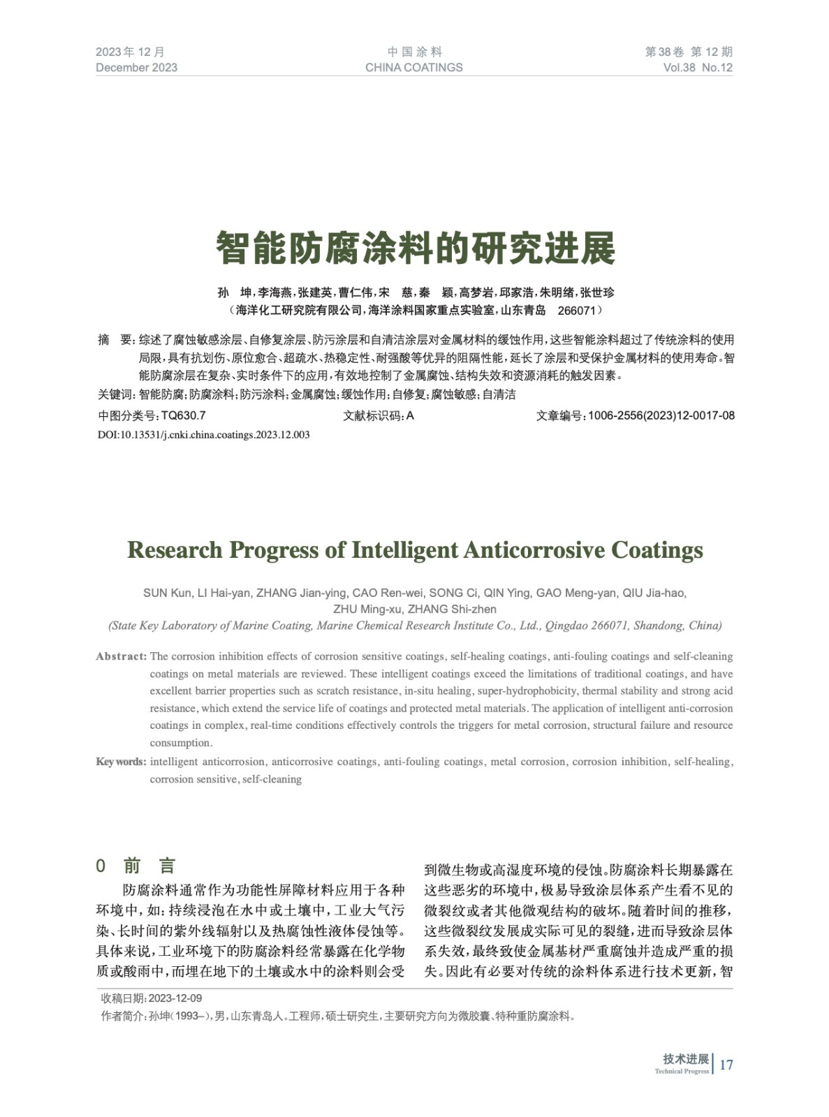 本文系作者@孫 坤,李海燕,張建英,曹仁偉,宋 慈,秦 穎,高夢巖,邱家浩,朱明緒,張世珍 授權中國涂料網發表,并經中國涂料網編輯,未經允許不得轉載,如需轉載請聯系chinacoatingnet@vip.163.com