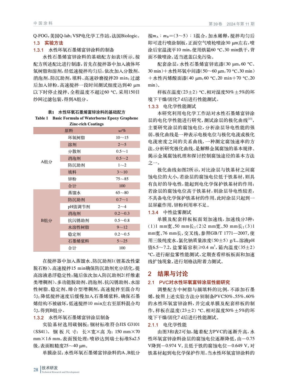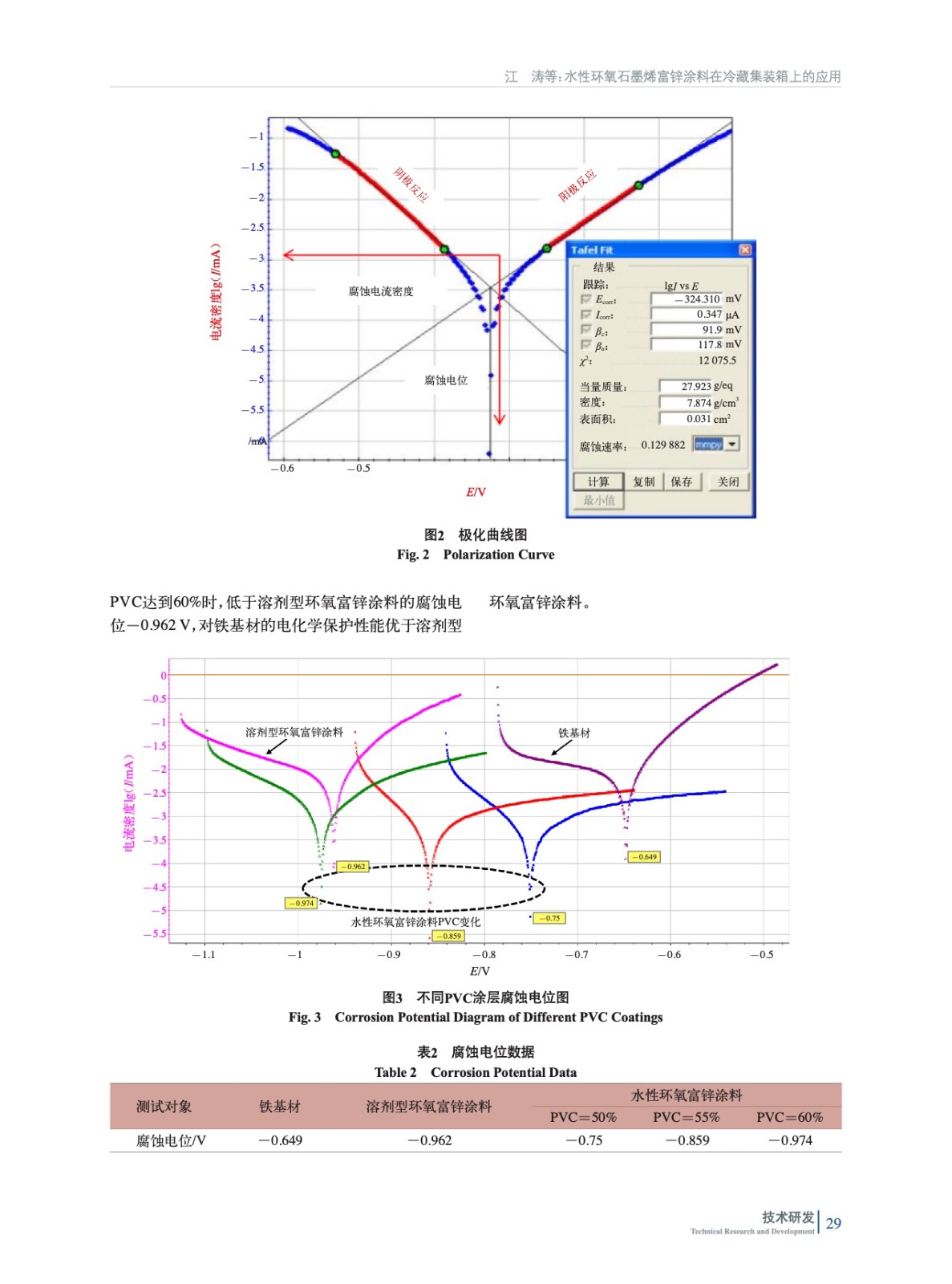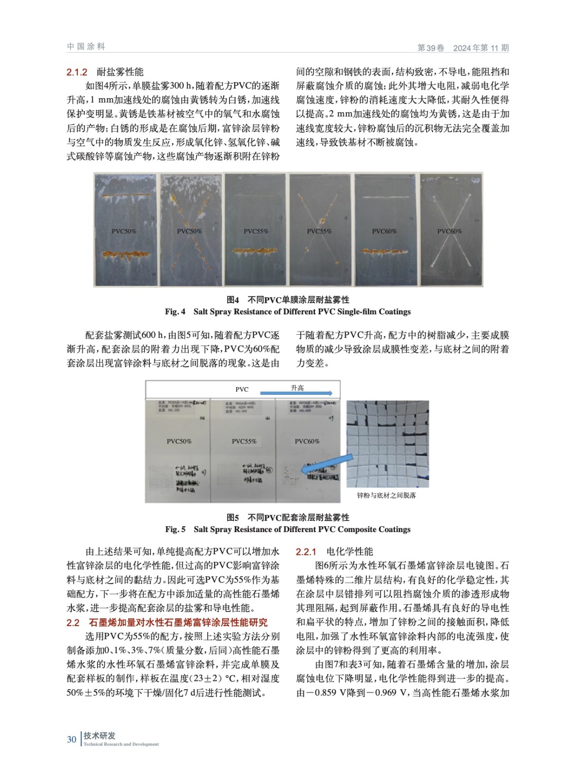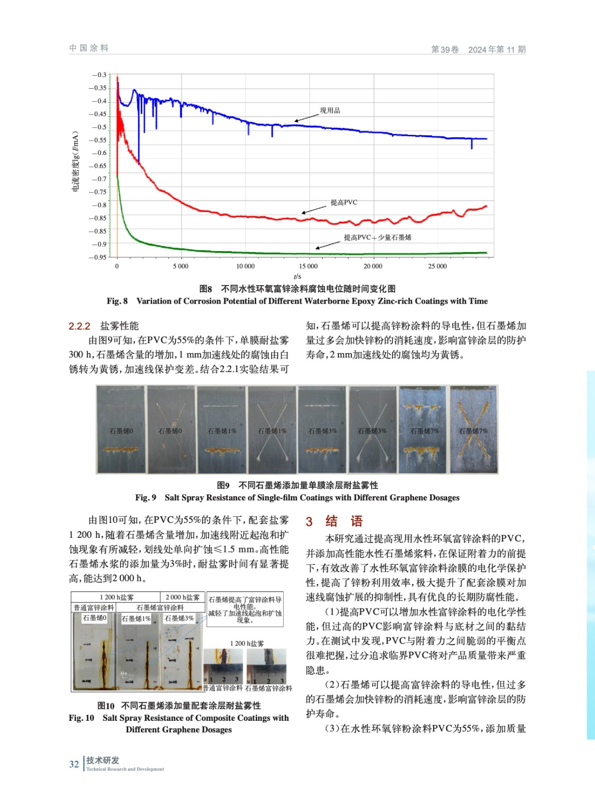 摘要:為改善現用水性環氧富鋅涂料對鐵基材的電化學保護性能,需提高富鋅涂層的導電性,且不能影響配套涂層的長期防腐性能。通過提高配方中的顏料體積濃度(PVC),同時添加適量的高性能石墨烯漿料,制備了一種具有優良電化學保護性能和防腐性能的水性環氧石墨烯富鋅涂料。在配方PVC調整到55%,高性能石墨烯水漿質量分數為3%的情況下,所制備的水性環氧石墨烯富鋅涂層的綜合性能最好,其配套涂層經中性鹽霧試驗2 000 h后依然具有良好的附著力,加速線附近起泡和擴蝕現象較現用產品有明顯改善,劃線處單向擴蝕≤1.5 mm。在保證涂層附著力的前提下提高配方PVC,添加適量的高性能石墨烯漿料,提升了鋅粉的利用效率,改善涂層電化學性能的同時兼顧了涂層綜合性能的提升,全面改善整體配套的防腐性能,延長了配套涂層使用壽命。