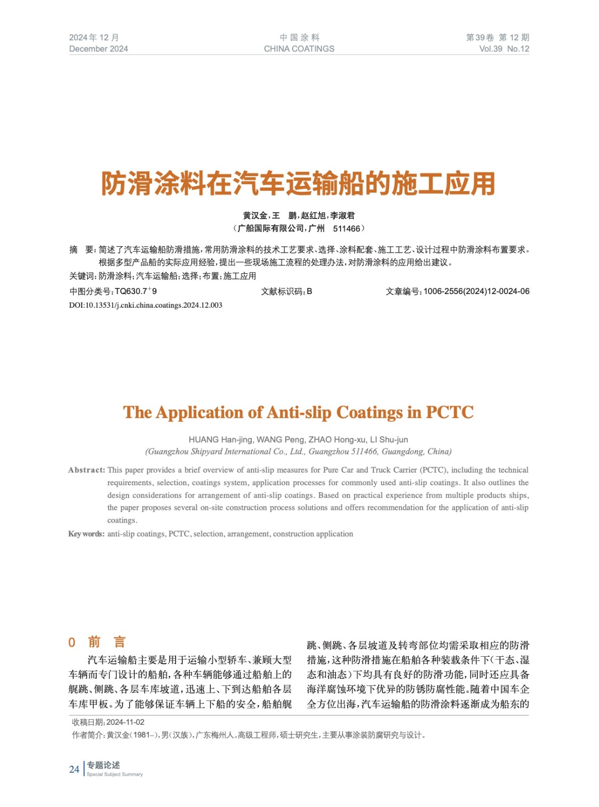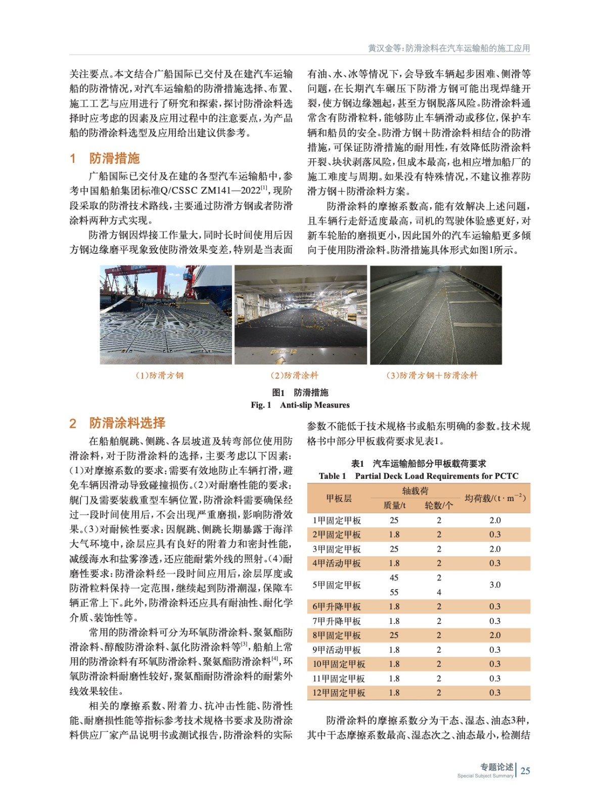 摘要:簡述了汽車運輸船防滑措施,常用防滑涂料的技術(shù)工藝要求、選擇、涂料配套、施工工藝、設(shè)計過程中防滑涂料布置要求。根據(jù)多型產(chǎn)品船的實際應(yīng)用經(jīng)驗,提出一些現(xiàn)場施工流程的處理辦法,對防滑涂料的應(yīng)用給出建議。