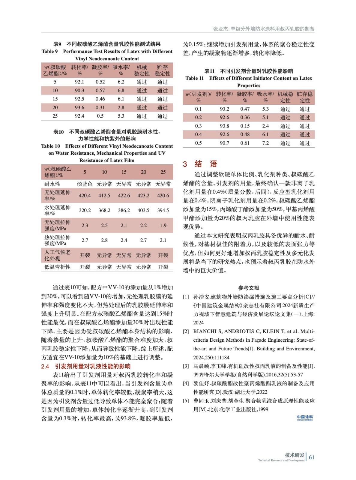 通過調整軟硬單體比例、乳化劑種類、叔碳酸乙烯酯的含量、引發劑的用量測試了乳膠力學、耐候和耐水等性能,制備出適用于建筑外墻的叔丙乳膠,對單組分叔丙乳膠制備具有一定的指導意義。