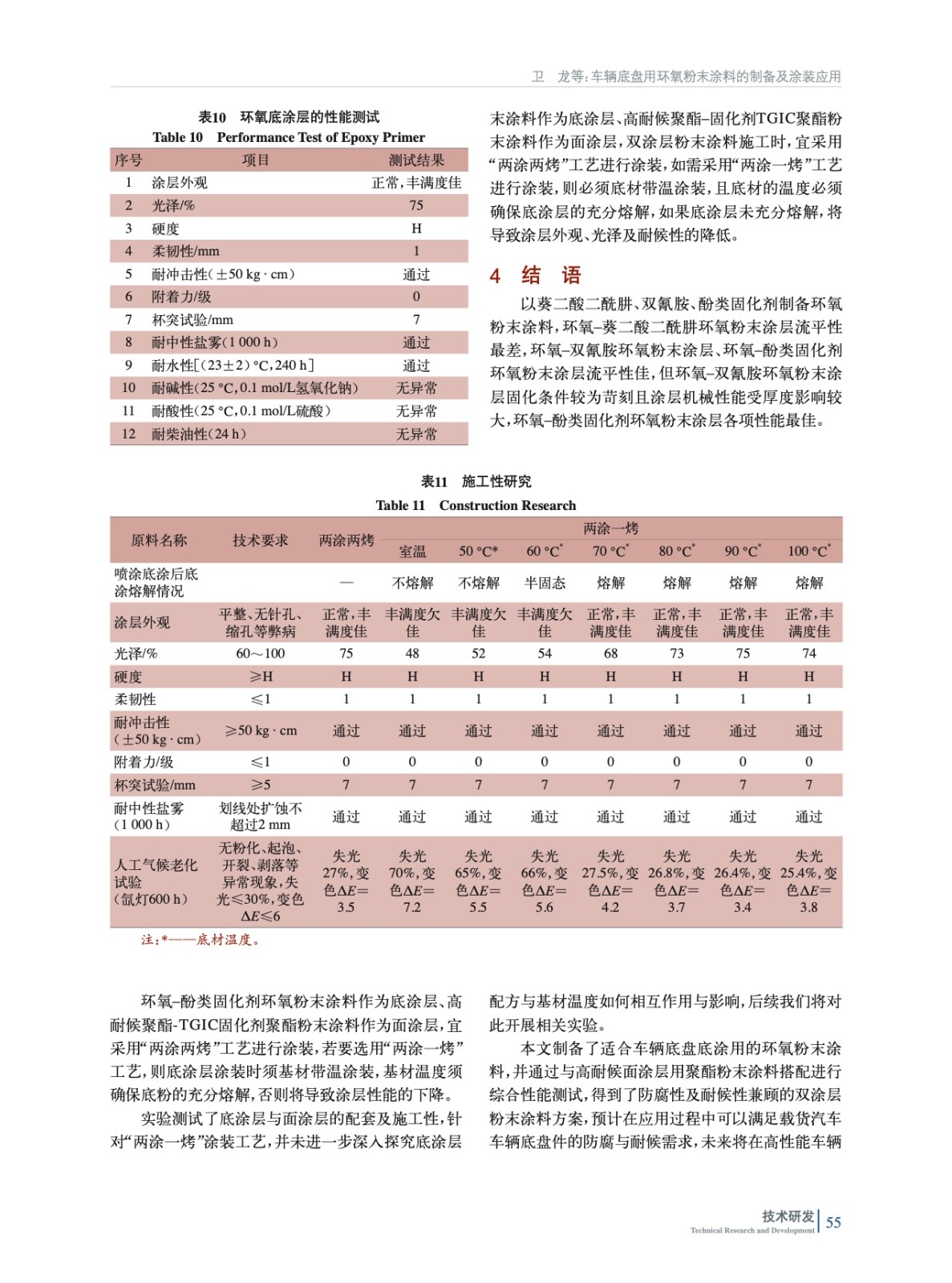 摘要:針對車輛底盤作業環境及使用要求,通過研究環氧樹脂、固化劑種類及用量、助劑等對環氧涂層性能的影響,制備了適合車輛底盤底涂用的環氧粉末涂料,并通過與高耐候面涂層用聚酯粉末涂料搭配進行綜合性能測試,得到了適合車輛底盤用的雙涂層粉末涂料體系與涂裝工藝,解決了車輛底盤粉末涂裝時的耐鹽霧及耐老化問題。