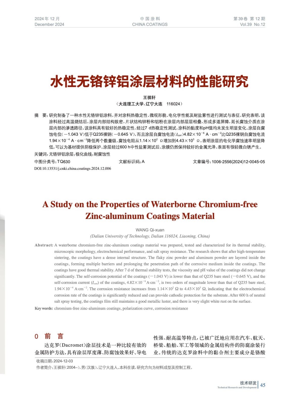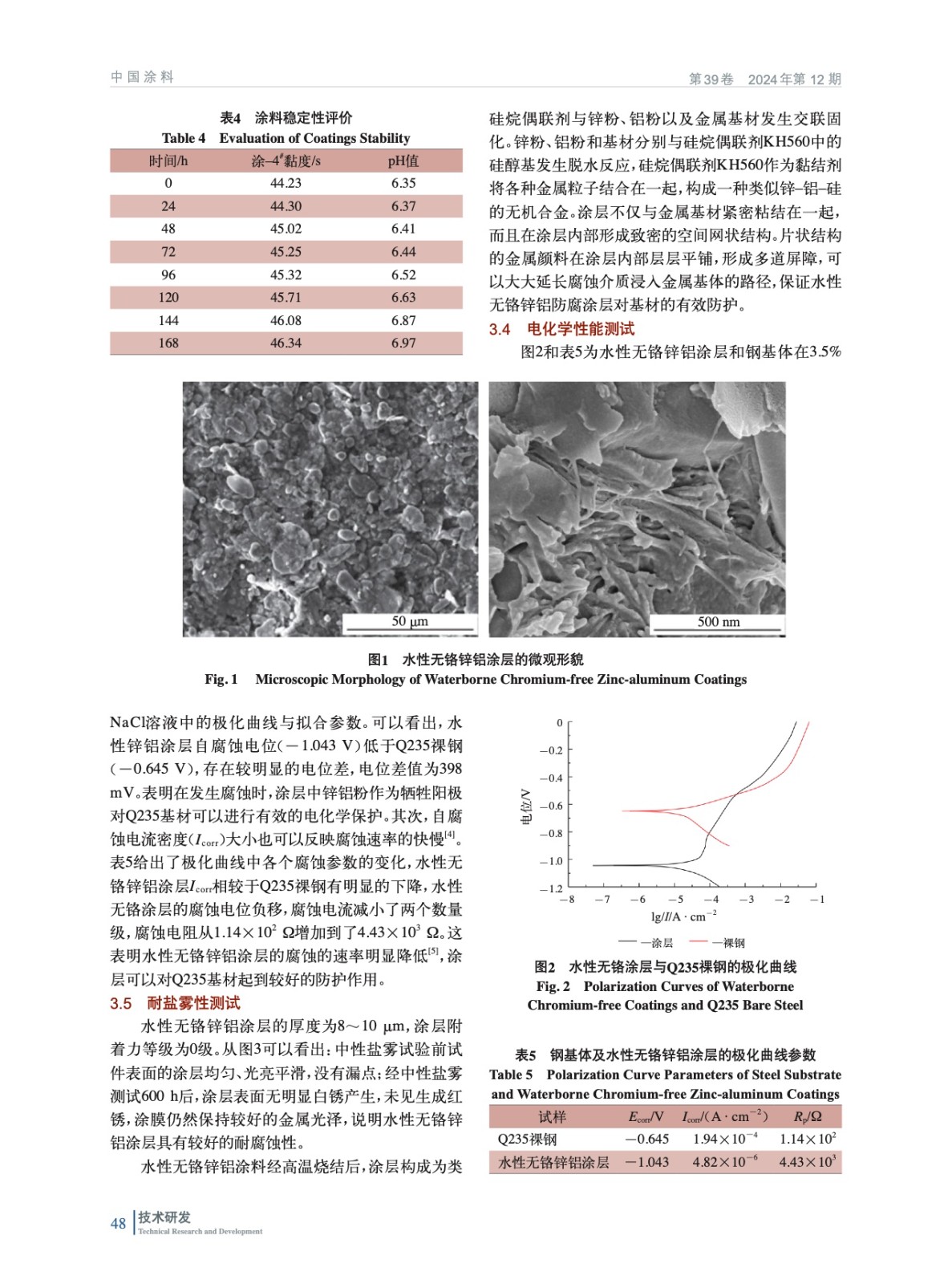 摘要:研究制備了一種水性無鉻鋅鋁涂料,并對涂料熱穩定性、微觀形貌、電化學性能及耐鹽霧性進行測試與表征。研究表明,該涂料經過高溫燒結后,涂層內部結構致密,片狀結構鋅粉和鋁粉在涂層內部層層相疊,形成多道屏障,延長腐蝕介質在涂層內部的滲透路徑。該涂料具有較好的熱穩定性,經過7 d熱穩定性測試,涂料的黏度和pH值均未發生明顯變化。涂層自腐蝕電位(-1.043 V)低于Q235祼鋼(-0.645 V),而且涂層自腐蝕電流(Icorr)4.82×10-6 A·cm-2比Q235祼鋼自腐蝕電流1.94×10-4 A·cm-2降低兩個數量級,腐蝕電阻從1.14×102 Ω增加到4.43×103 Ω,表明涂層的電化學腐蝕速率明顯降低,可以為基材提供陰極保護。涂層經過600 h中性鹽霧測試后,涂膜仍然保持較好的金屬光澤,表面有很輕微白銹產生。