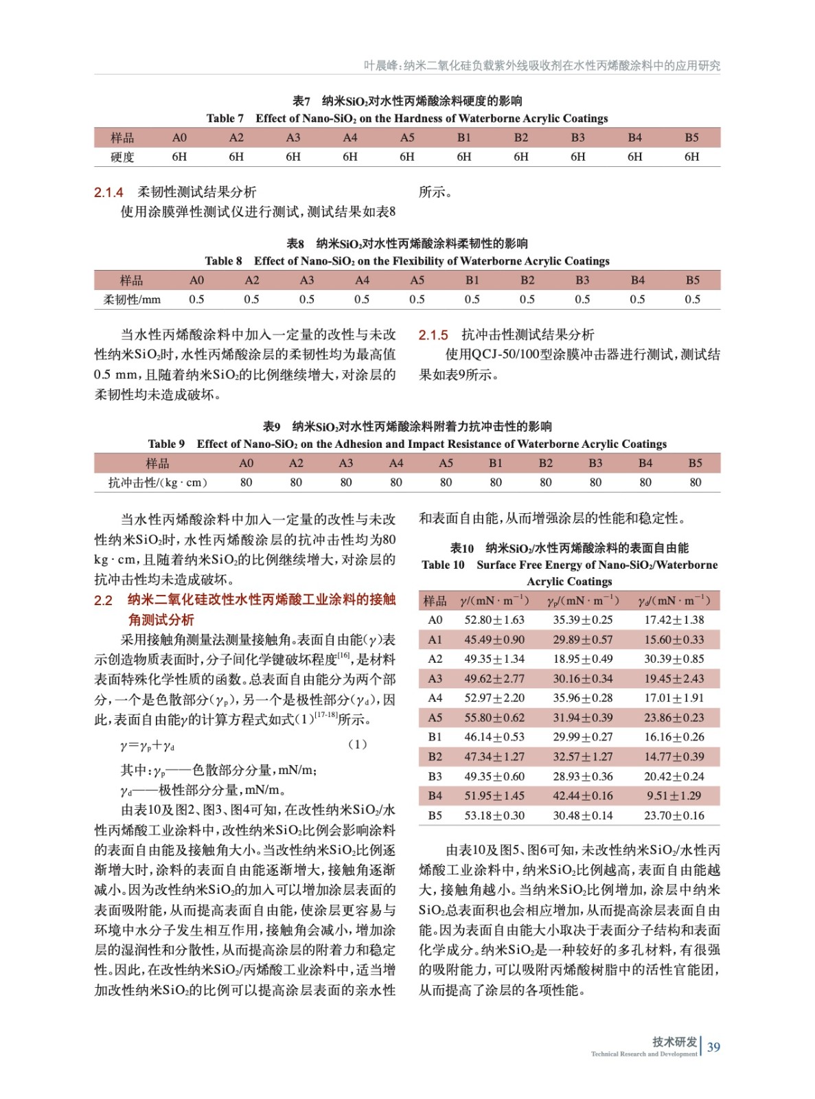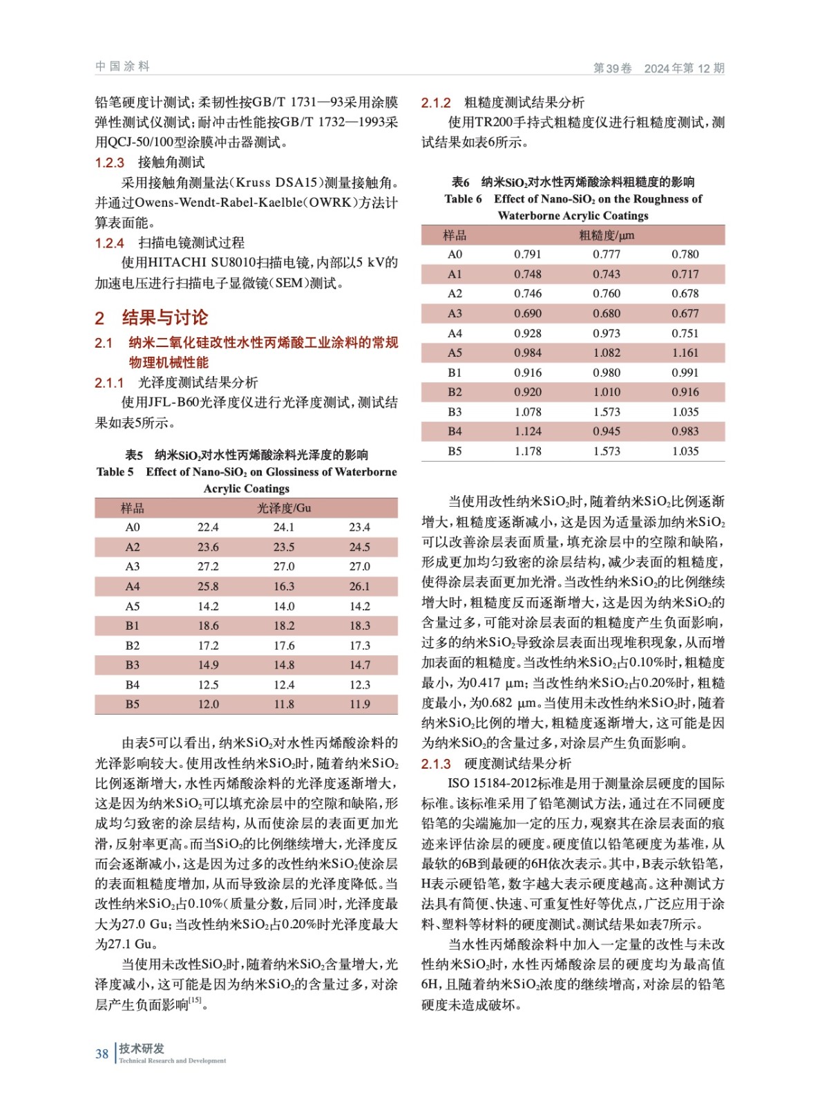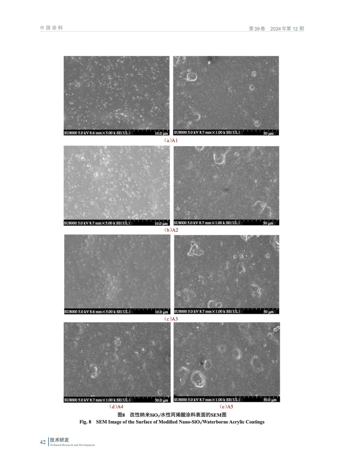 摘要:研究旨在制備負載紫外線的納米二氧化硅(SiO2)改性的水性丙烯酸工業(yè)涂料,并研究改性納米SiO2含量對涂料性能的影響。采用了接觸角儀、掃描電鏡、常規(guī)物理機械性能等對多種手段對涂膜進行表征。研究結(jié)果表明,隨著改性納米SiO2含量的增加,涂層具有較好的常規(guī)物理機械性能,并且光澤度有所提高。這表明,改性納米SiO2對涂料的增韌和增強效果顯著,能夠改善涂層的常規(guī)物理機械性能和表面性能。然而,當(dāng)改性納米SiO2含量達到一定值時,增加含量并不能繼續(xù)提高涂層的光澤度,甚至?xí)?dǎo)致涂層表面性能變差。這是因為,改性納米SiO2在涂層中的分散度和填充效果受到含量的影響,達到一定含量后,納米SiO2顆粒之間的互相聚集和堆積現(xiàn)象會加劇,使涂層的表面質(zhì)量受到損害。