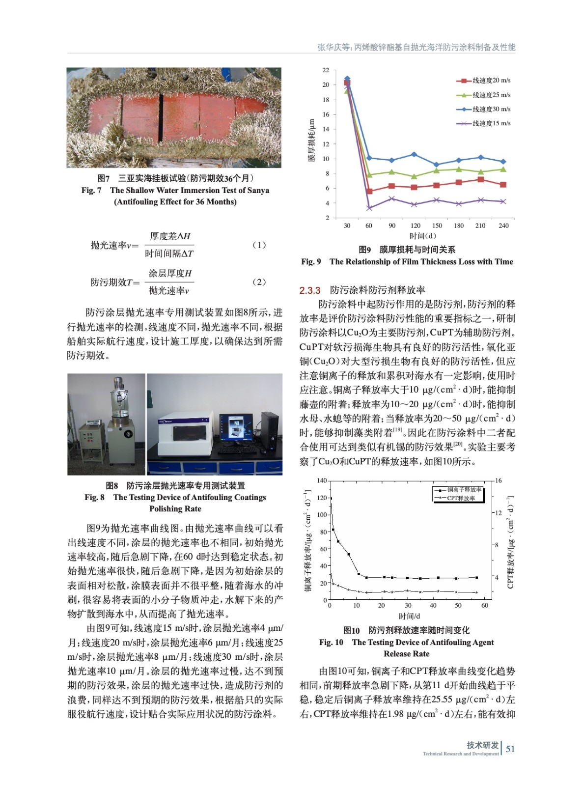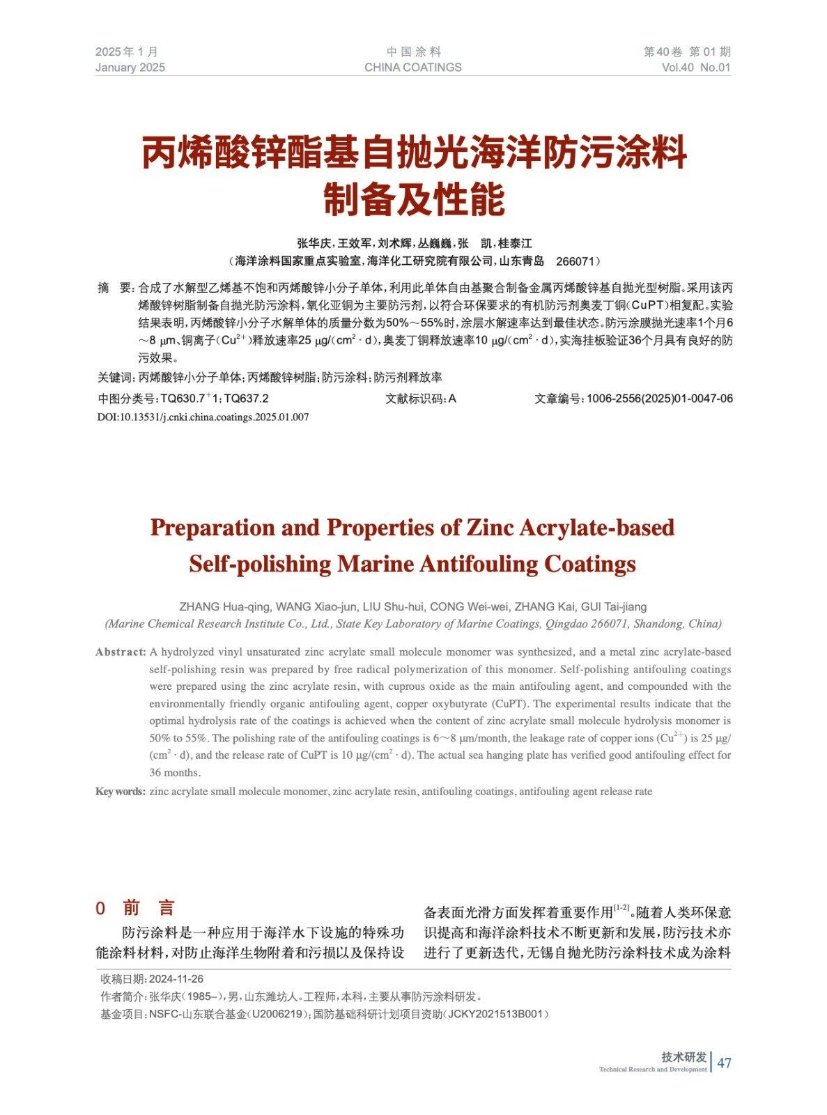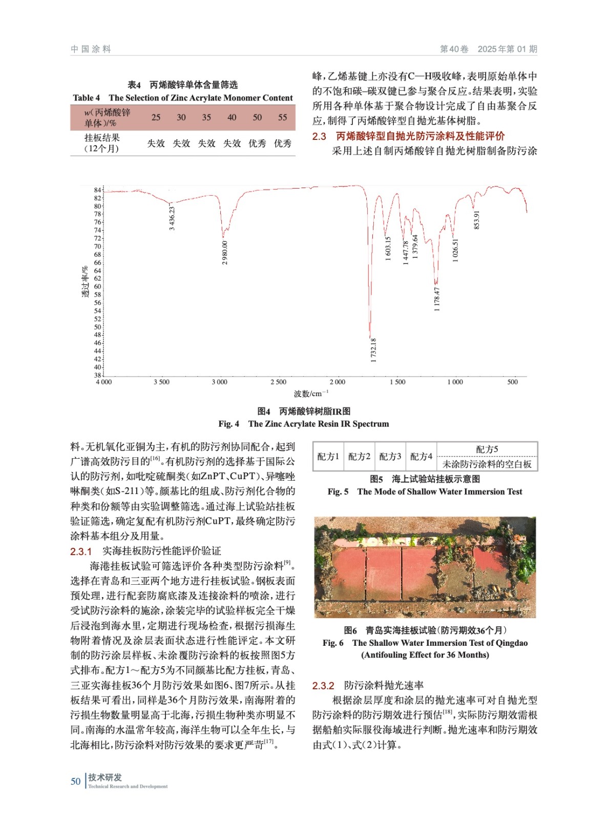 摘要:合成了水解型乙烯基不飽和丙烯酸鋅小分子單體,利用此單體自由基聚合制備金屬丙烯酸鋅基自拋光型樹(shù)脂。采用該丙烯酸鋅樹(shù)脂制備自拋光防污涂料,氧化亞銅為主要防污劑,以符合環(huán)保要求的有機(jī)防污劑奧麥丁銅(CuPT)相復(fù)配。實(shí)驗(yàn)結(jié)果表明,丙烯酸鋅小分子水解單體的質(zhì)量分?jǐn)?shù)為50%~55%時(shí),涂層水解速率達(dá)到最佳狀態(tài)。防污涂膜拋光速率1個(gè)月6~8 μm、銅離子(Cu2+)釋放速率25 μg/(cm2·d),奧麥丁銅釋放速率10 μg/(cm2·d),實(shí)海掛板驗(yàn)證36個(gè)月具有良好的防污效果。