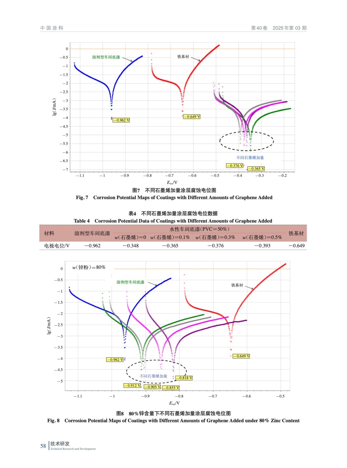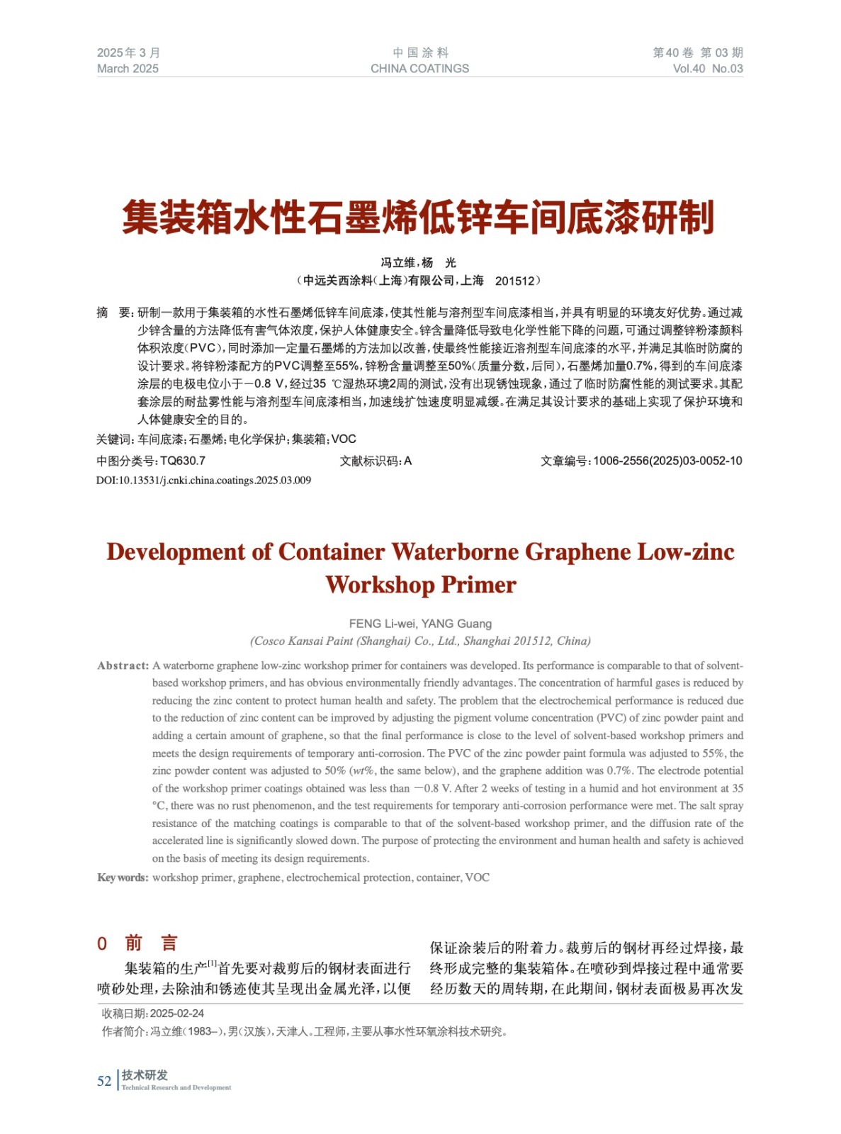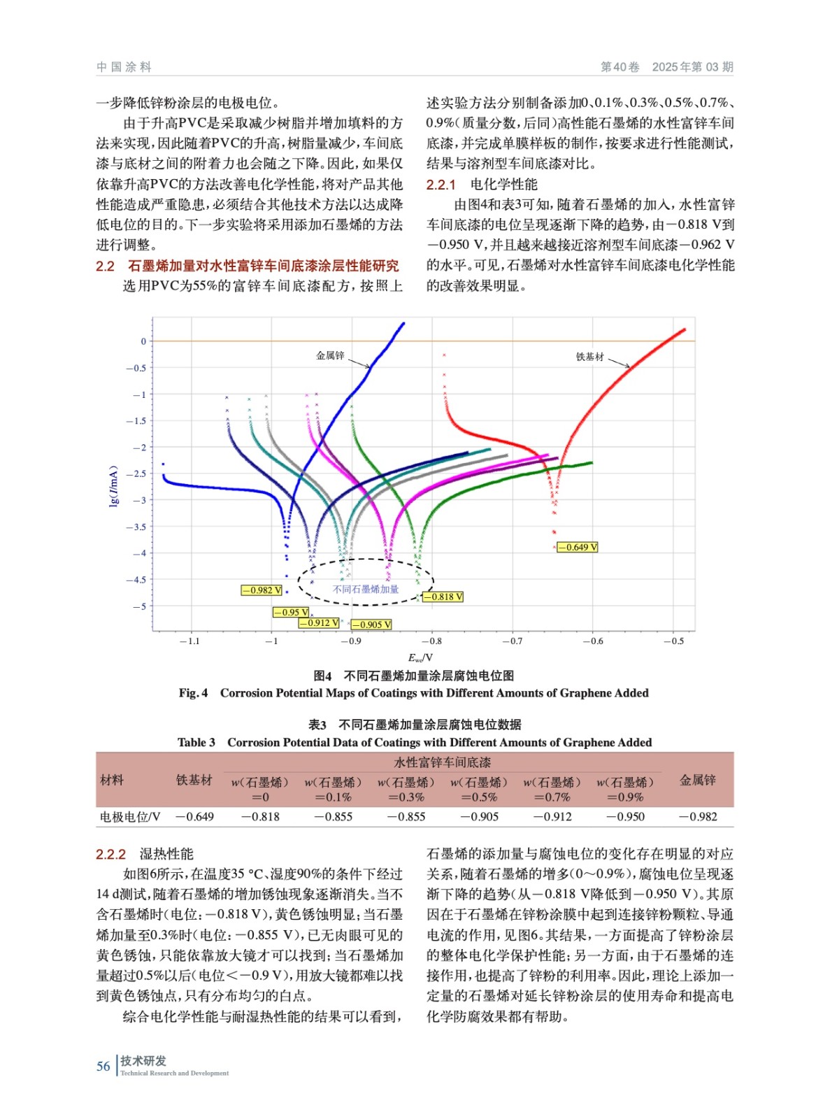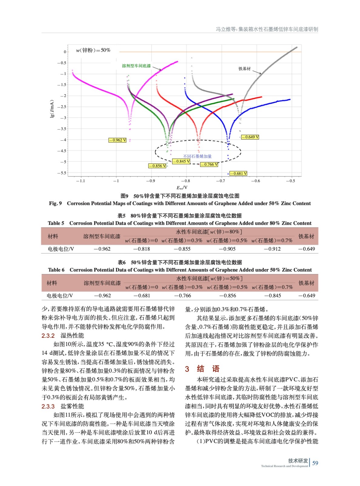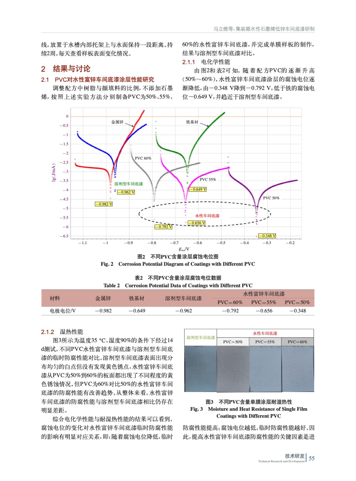 摘要:研制一款用于集裝箱的水性石墨烯低鋅車間底漆,使其性能與溶劑型車間底漆相當,并具有明顯的環境友好優勢。通過減少鋅含量的方法降低有害氣體濃度,保護人體健康安全。鋅含量降低導致電化學性能下降的問題,可通過調整鋅粉漆顏料體積濃度(PVC),同時添加一定量石墨烯的方法加以改善,使最終性能接近溶劑型車間底漆的水平,并滿足其臨時防腐的設計要求。將鋅粉漆配方的PVC調整至55%,鋅粉含量調整至50%(質量分數,后同),石墨烯加量0.7%,得到的車間底漆涂層的電極電位小于-0.8 V,經過35 ℃濕熱環境2周的測試,沒有出現銹蝕現象,通過了臨時防腐性能的測試要求。其配套涂層的耐鹽霧性能與溶劑型車間底漆相當,加速線擴蝕速度明顯減緩。在滿足其設計要求的基礎上實現了保護環境和人體健康安全的目的。