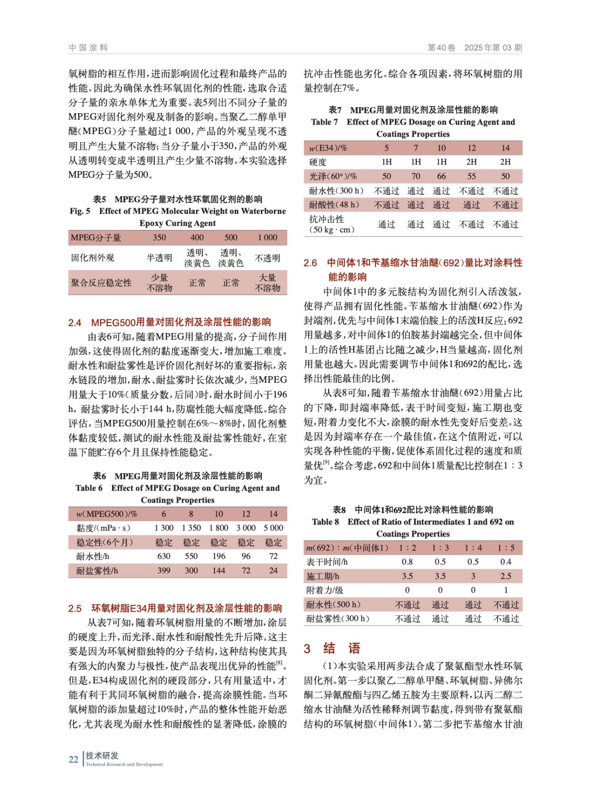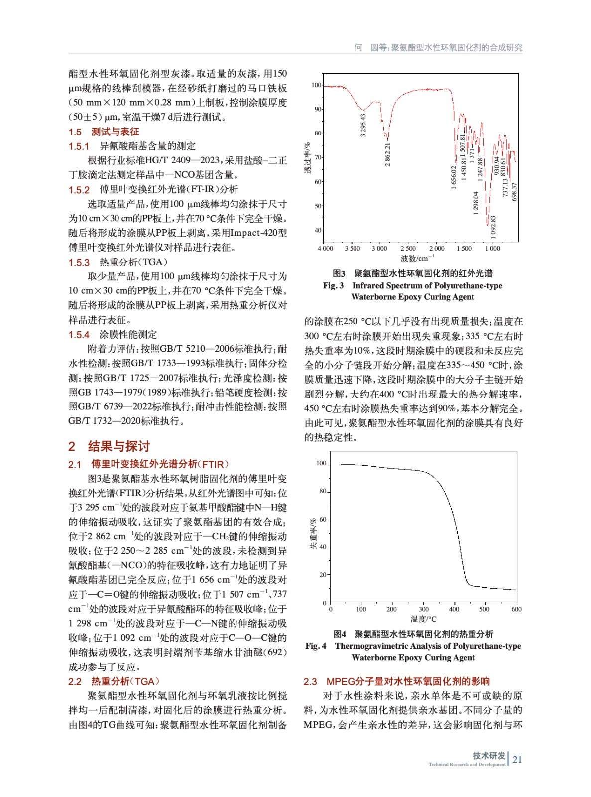 摘要:用聚乙二醇單甲醚(MPEG)、環(huán)氧樹脂(E34)與異佛爾酮二異氰酸酯(IPDI)反應(yīng),加入活性稀釋劑丙二醇二縮水甘油醚(207)調(diào)整體系的黏度,得到帶有聚氨酯結(jié)構(gòu)的環(huán)氧樹脂,再加入四乙烯五胺(TEPA)合成得到環(huán)氧改性胺(中間體1),選用芐基縮水甘油醚(692)作為封端劑與合成的中間體1反應(yīng),成功制備得到聚氨酯型水性環(huán)氧固化劑。采用傅里葉變換紅外光譜(FT-IR)、熱重分析(TGA)對產(chǎn)品和涂膜進行測試及表征;同時,考察聚乙二醇單甲醚種類和用量、環(huán)氧樹脂用量、692和中間體1配比對固化劑和涂料性能的影響。結(jié)果表明:聚乙二醇單甲醚的分子量為500、質(zhì)量分數(shù)6%~8%,環(huán)氧樹脂質(zhì)量分數(shù)7%~9%,m(692)∶m(中間體1)為1∶3,合成的固化劑貯存穩(wěn)定性好,且制備的涂膜也具有較好的耐水性、附著力、硬度等性能。