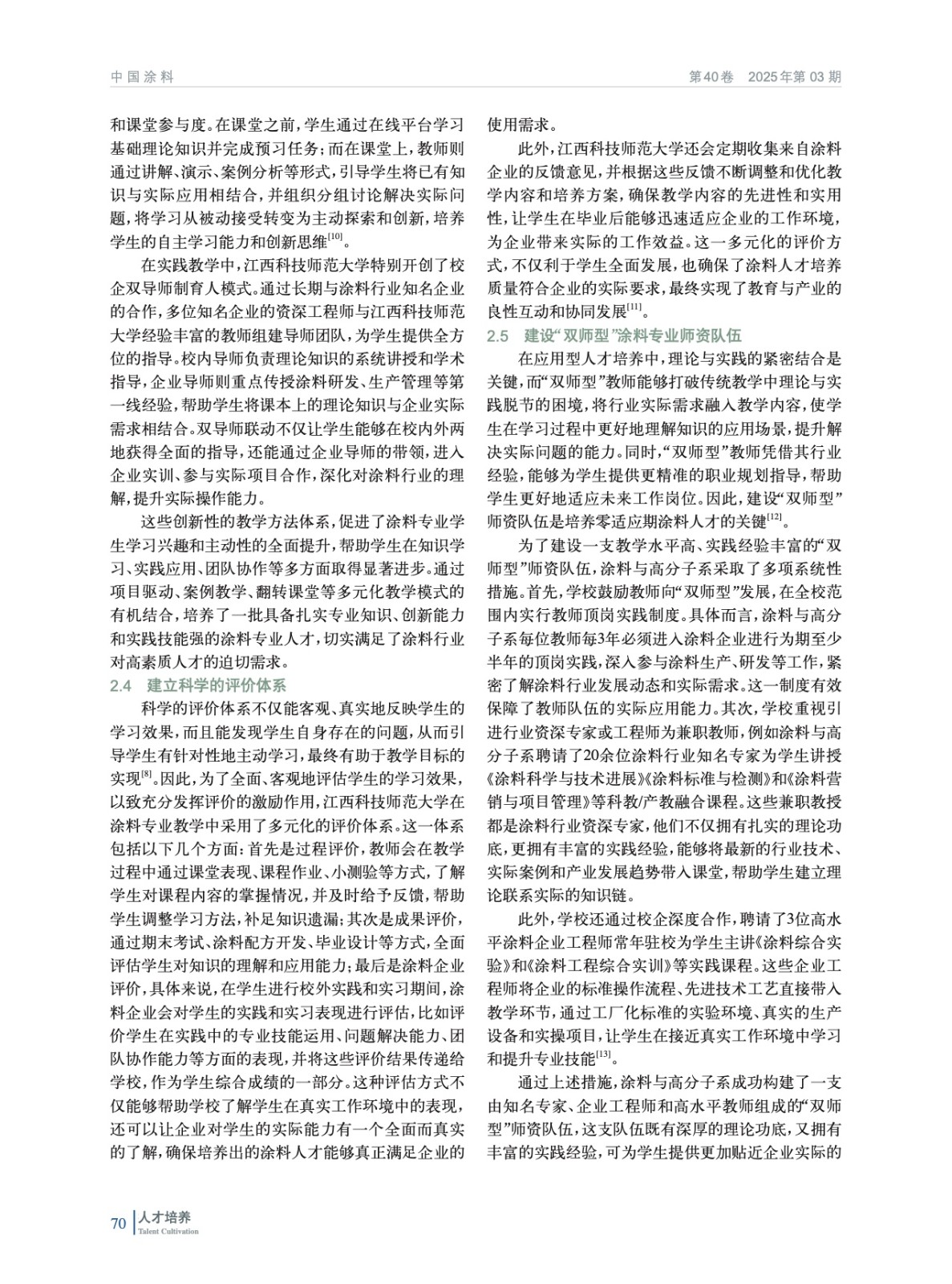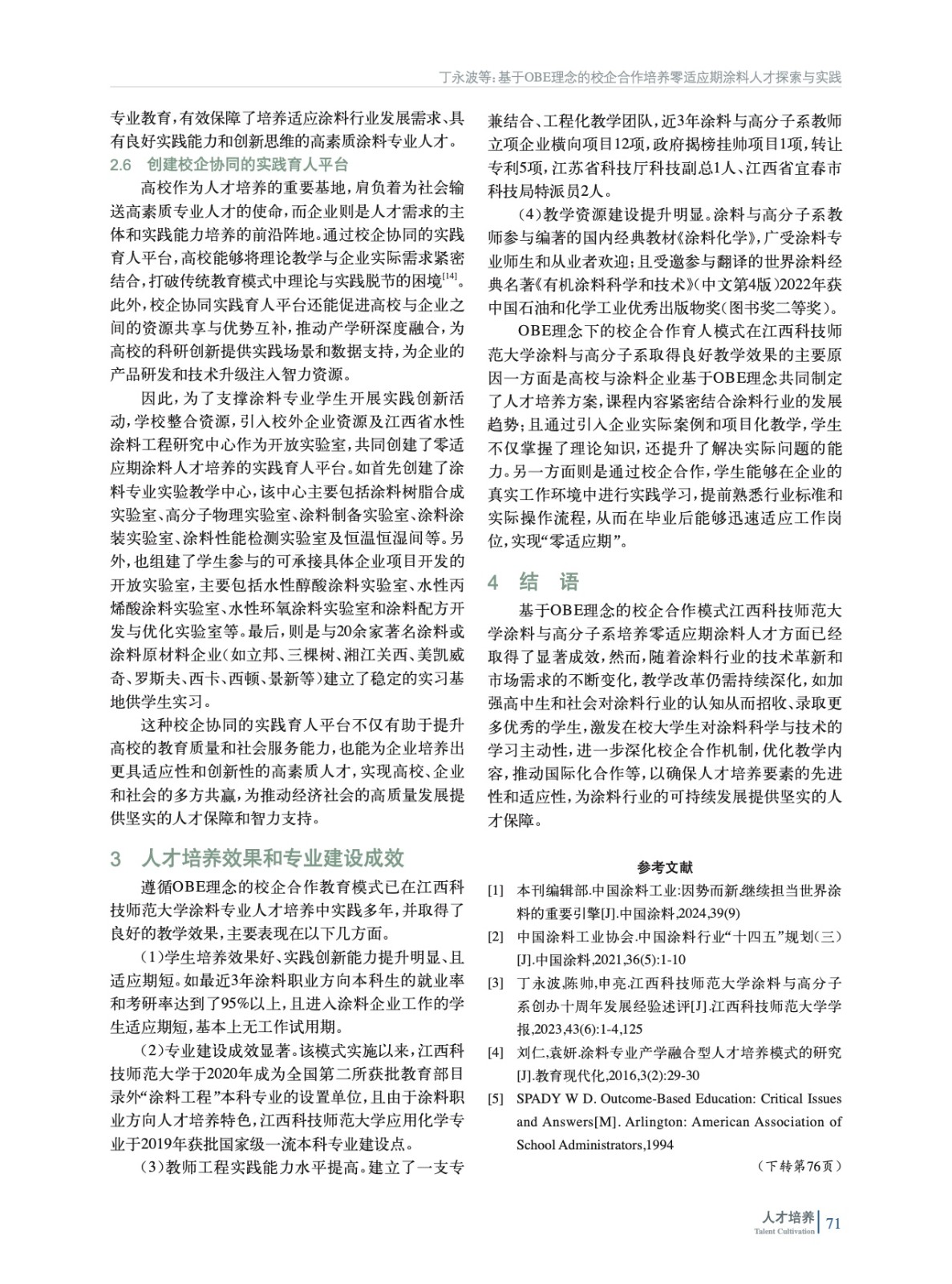 摘要:論述了當(dāng)前涂料行業(yè)人才需求現(xiàn)狀及涂料類人才培養(yǎng)存在的問(wèn)題;闡述了基于成果導(dǎo)向教育(OBE)理念的校企合作人才培養(yǎng)模式;介紹了基于OBE理念的校企合作模式在江西科技師范大學(xué)培養(yǎng)零適應(yīng)期涂料人才方面的探索與實(shí)踐,包括制定遵循OBE理念的校企合作人才培養(yǎng)方案、重構(gòu)課程體系、創(chuàng)新教學(xué)模式、建立評(píng)價(jià)體系等具體措施。實(shí)踐結(jié)果表明,基于OBE理念的校企合作模式有效縮短了大學(xué)畢業(yè)生適應(yīng)期,提高了就業(yè)競(jìng)爭(zhēng)力,為涂料行業(yè)輸送了高素質(zhì)應(yīng)用型人才。