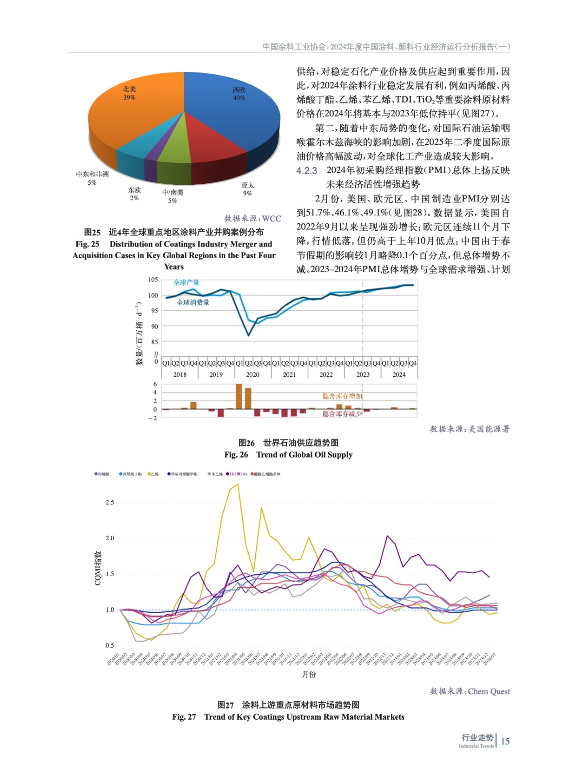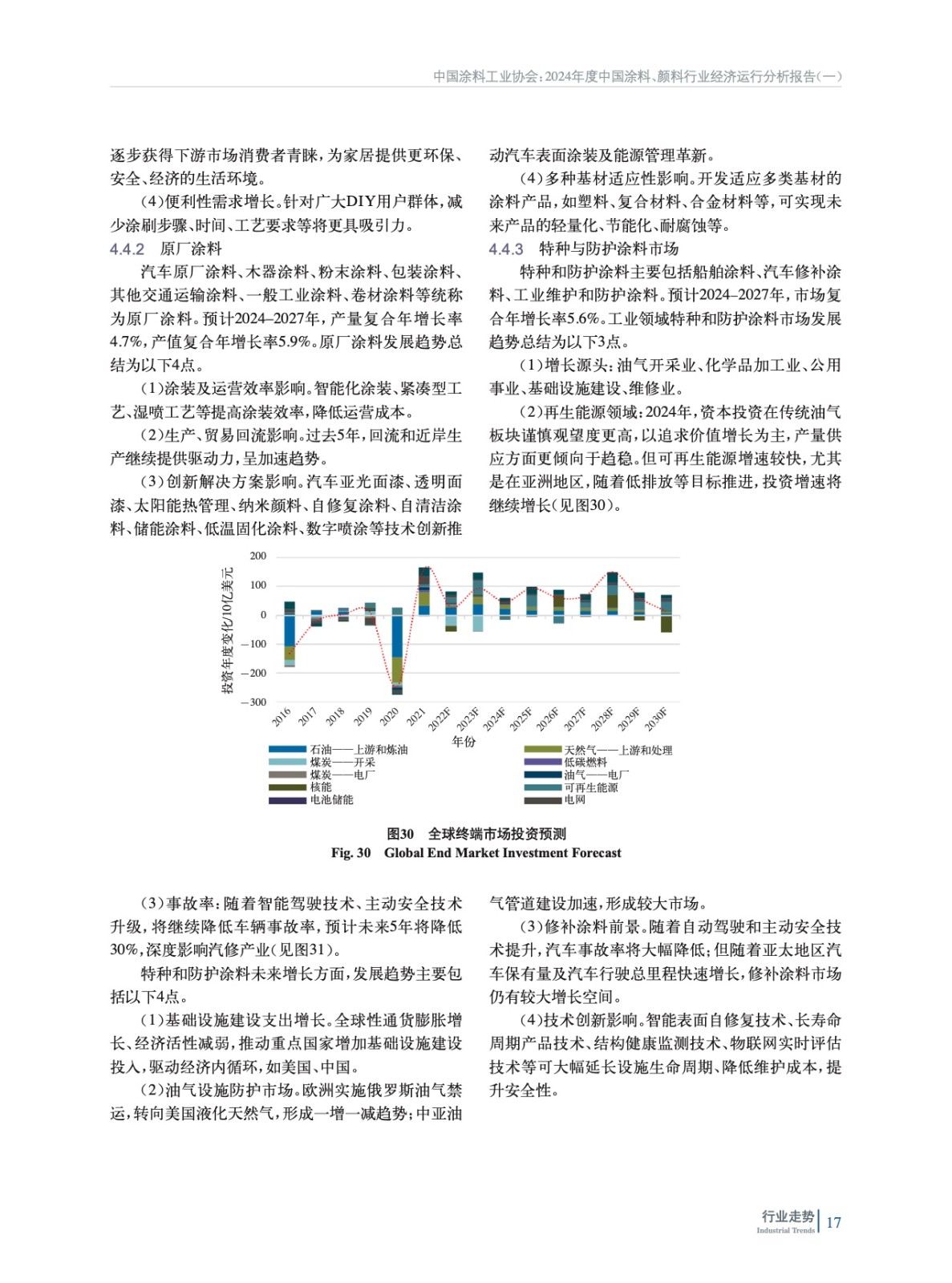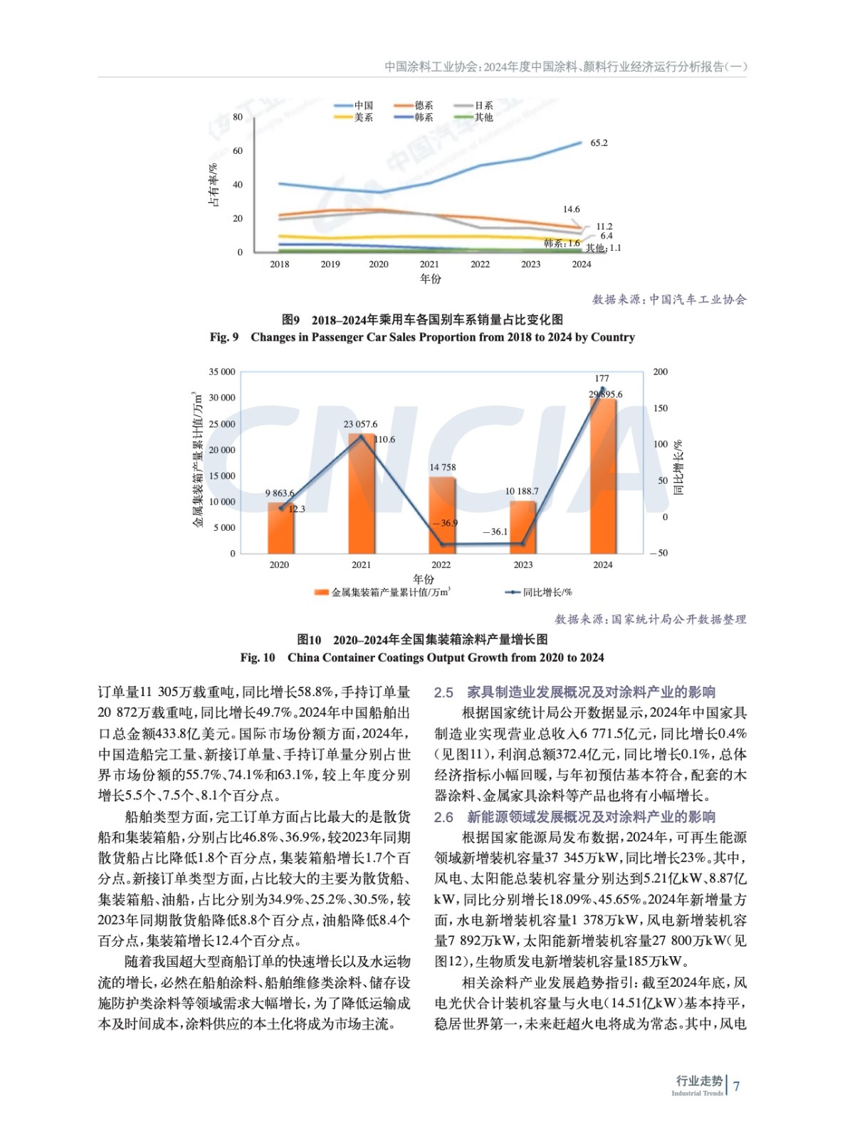 摘要:簡(jiǎn)析了2024年中國(guó)宏觀經(jīng)濟(jì)及外部環(huán)境發(fā)展情況,概括介紹了2024年房地產(chǎn)、機(jī)械、集裝箱、船舶、家具、新能源等涂料重點(diǎn)下游行業(yè)、新興領(lǐng)域發(fā)展概況及對(duì)涂料行業(yè)的影響,重點(diǎn)分析了2024年度中國(guó)涂料行業(yè)發(fā)展和進(jìn)出口情況。綜述了全球涂料行業(yè)發(fā)展概況,對(duì)2024年全球涂料行業(yè)發(fā)展影響因素、全球涂料行業(yè)增長(zhǎng)動(dòng)力、全球涂料行業(yè)細(xì)分領(lǐng)域趨勢(shì)進(jìn)行了分析。最后對(duì)涂料上游鈦白粉、氧化鐵、丙烯酸乳液和環(huán)氧樹脂等重點(diǎn)原材料領(lǐng)域發(fā)展情況進(jìn)行了概述,并對(duì)中國(guó)涂料行業(yè)特征和發(fā)展趨勢(shì)進(jìn)行了分析和預(yù)測(cè)。