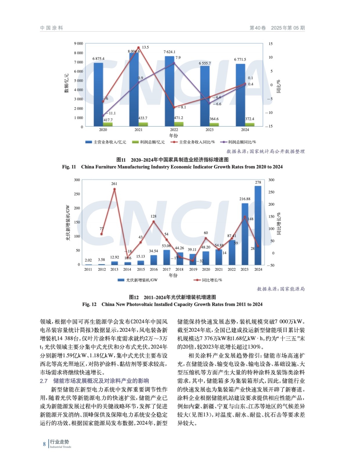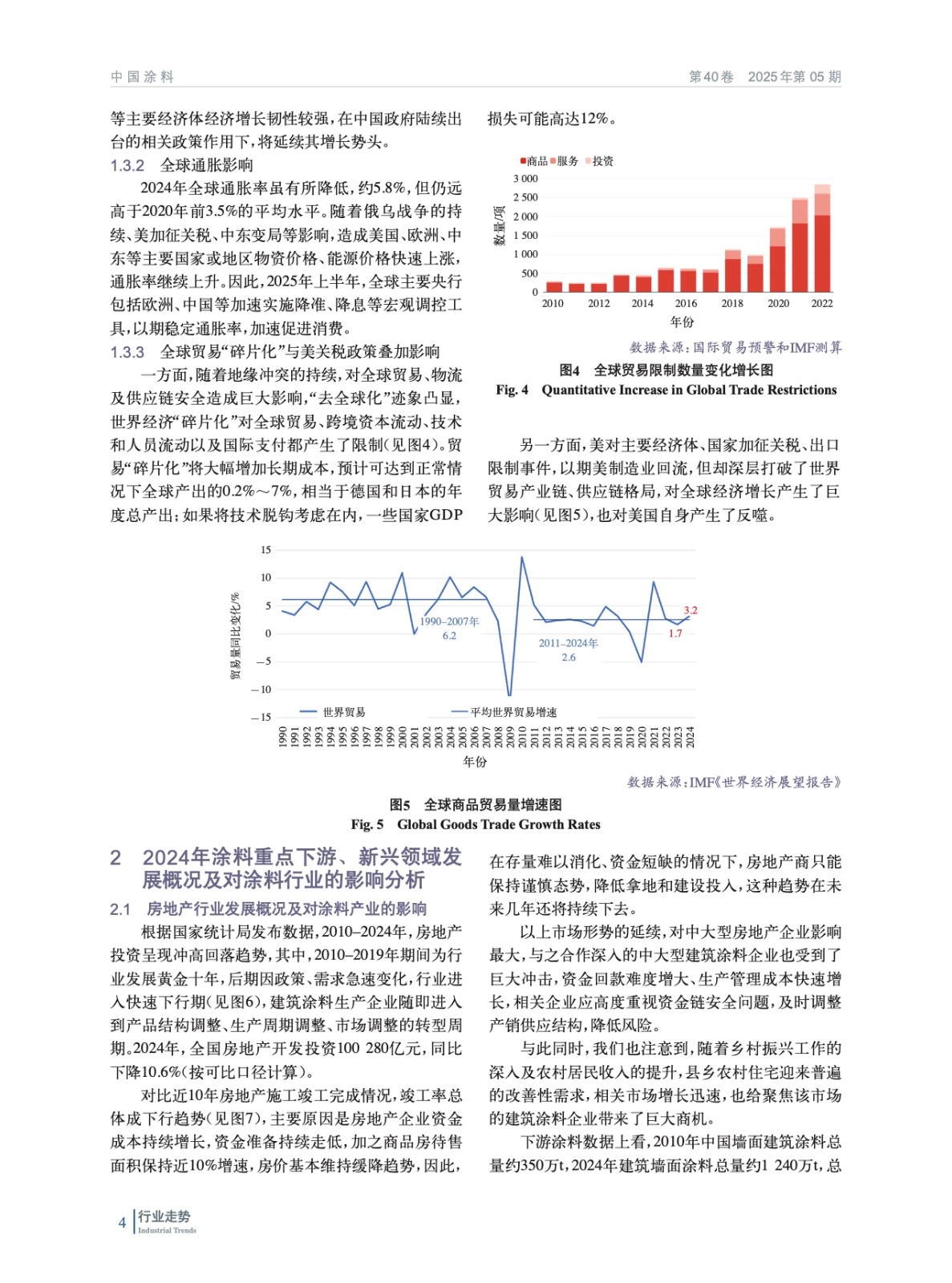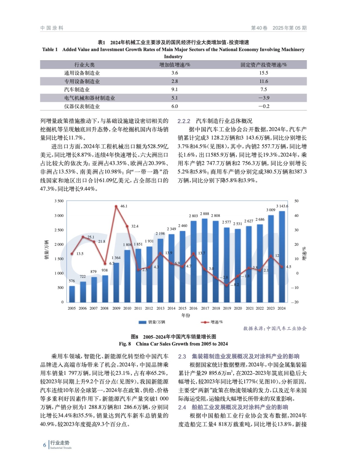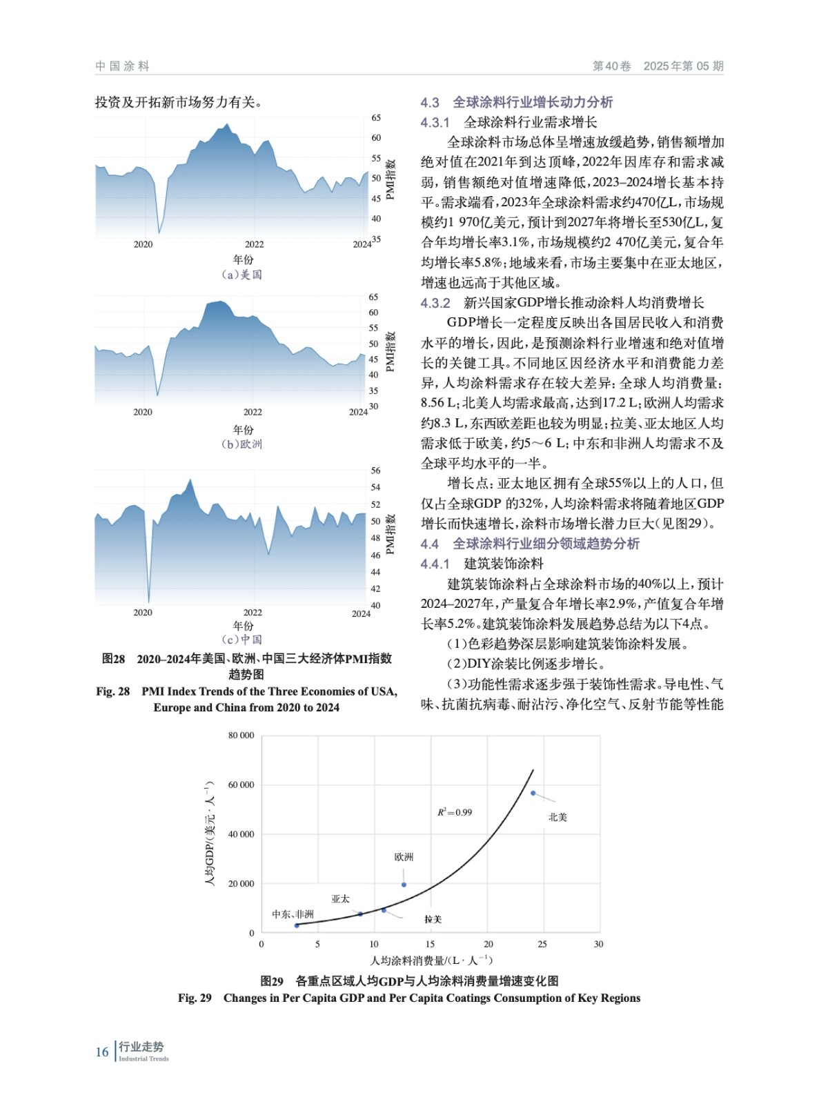 摘要:簡(jiǎn)析了2024年中國(guó)宏觀經(jīng)濟(jì)及外部環(huán)境發(fā)展情況,概括介紹了2024年房地產(chǎn)、機(jī)械、集裝箱、船舶、家具、新能源等涂料重點(diǎn)下游行業(yè)、新興領(lǐng)域發(fā)展概況及對(duì)涂料行業(yè)的影響,重點(diǎn)分析了2024年度中國(guó)涂料行業(yè)發(fā)展和進(jìn)出口情況。綜述了全球涂料行業(yè)發(fā)展概況,對(duì)2024年全球涂料行業(yè)發(fā)展影響因素、全球涂料行業(yè)增長(zhǎng)動(dòng)力、全球涂料行業(yè)細(xì)分領(lǐng)域趨勢(shì)進(jìn)行了分析。最后對(duì)涂料上游鈦白粉、氧化鐵、丙烯酸乳液和環(huán)氧樹脂等重點(diǎn)原材料領(lǐng)域發(fā)展情況進(jìn)行了概述,并對(duì)中國(guó)涂料行業(yè)特征和發(fā)展趨勢(shì)進(jìn)行了分析和預(yù)測(cè)。