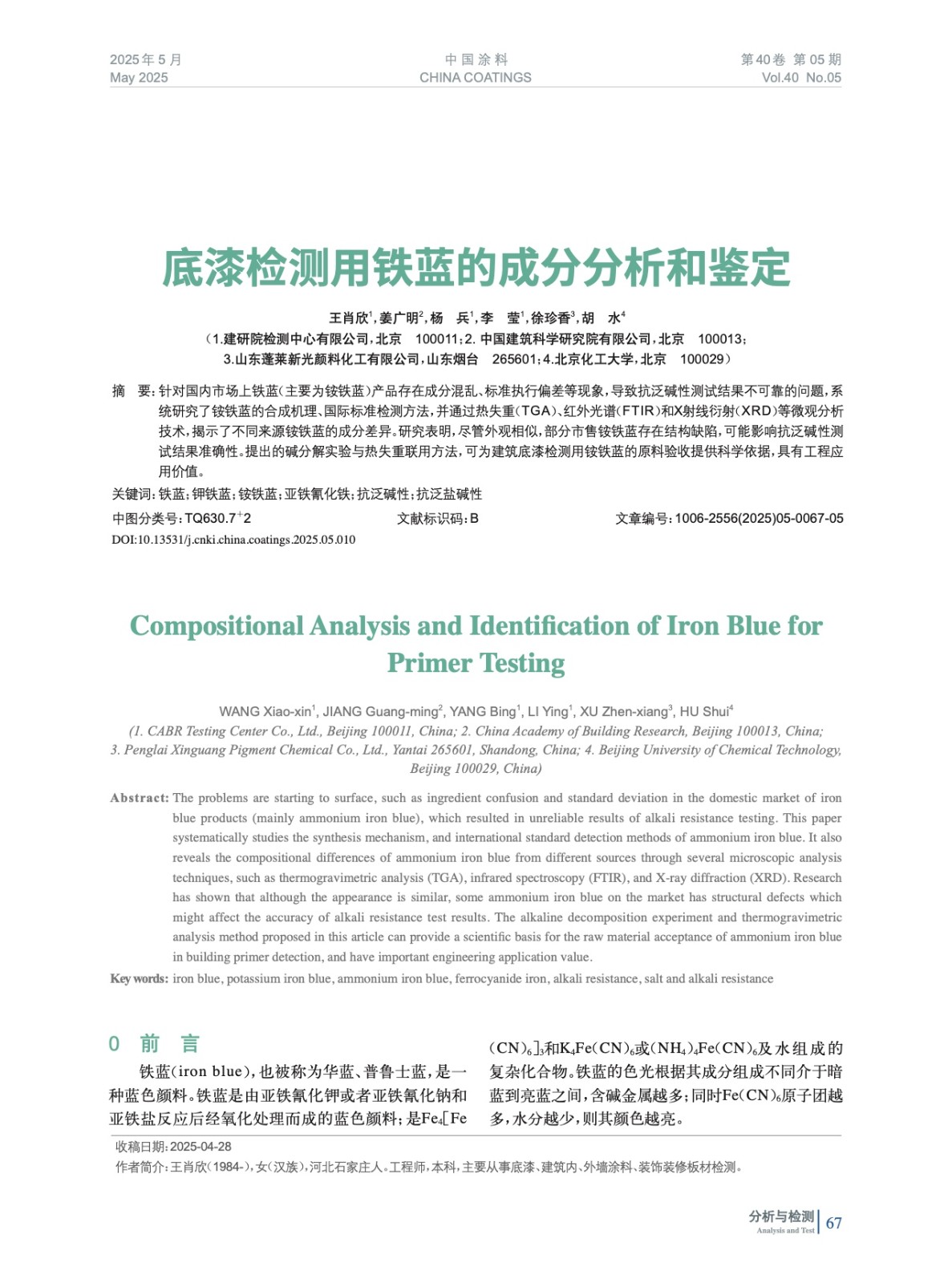 摘要:針對國內(nèi)市場上鐵藍(主要為銨鐵藍)產(chǎn)品存在成分混亂、標準執(zhí)行偏差等現(xiàn)象,導(dǎo)致抗泛堿性測試結(jié)果不可靠的問題,系統(tǒng)研究了銨鐵藍的合成機理、國際標準檢測方法,并通過熱失重(TGA)、紅外光譜(FTIR)和X射線衍射(XRD)等微觀分析技術(shù),揭示了不同來源銨鐵藍的成分差異。研究表明,盡管外觀相似,部分市售銨鐵藍存在結(jié)構(gòu)缺陷,可能影響抗泛堿性測試結(jié)果準確性。提出的堿分解實驗與熱失重聯(lián)用方法,可為建筑底漆檢測用銨鐵藍的原料驗收提供科學(xué)依據(jù),具有工程應(yīng)用價值。