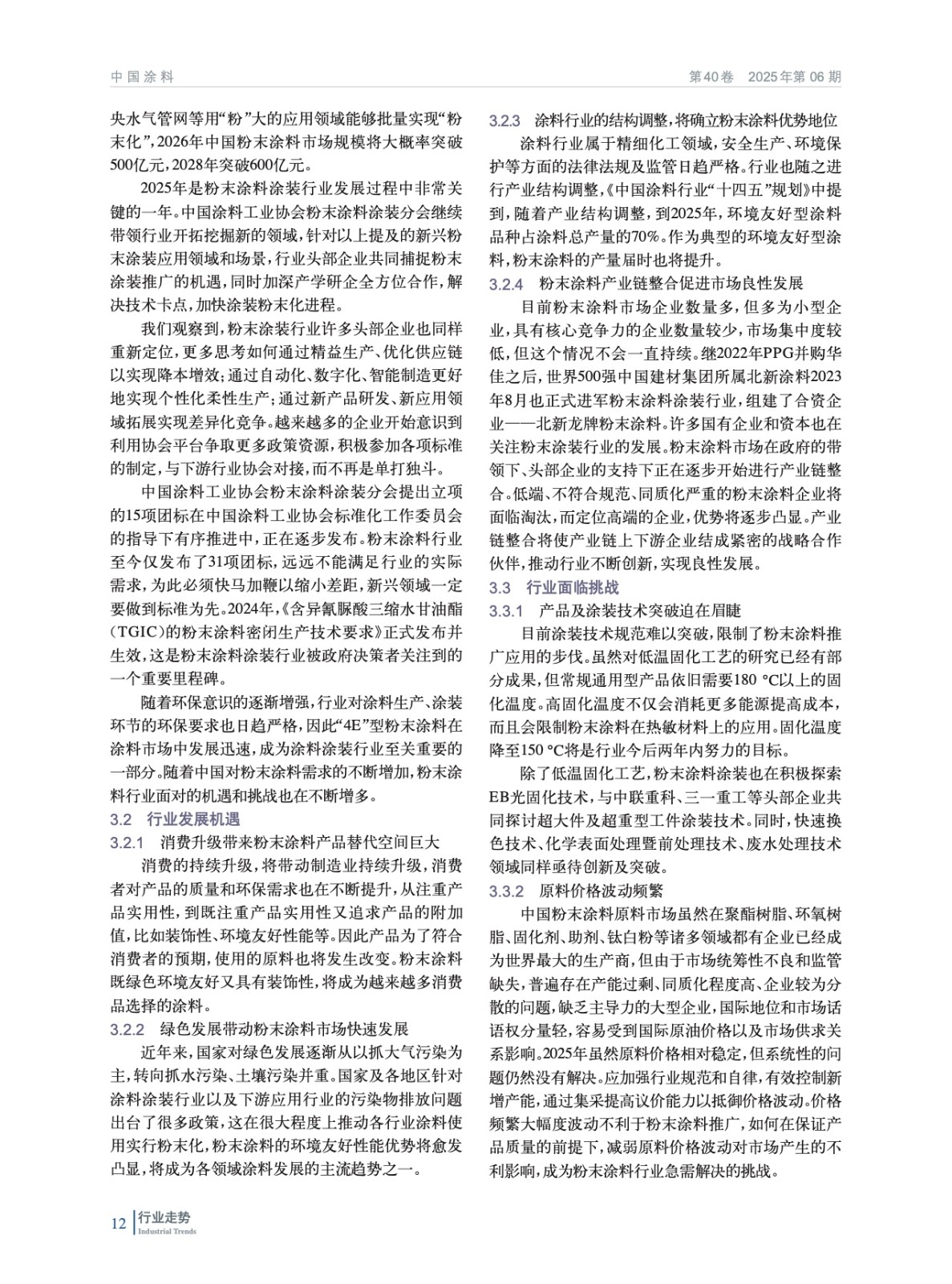 綜述了中國粉末涂料行業發展背景和動力、當前行業發展現狀,對2025–2029年粉末涂料市場規模、行業發展機遇和面臨的挑戰以及發展趨勢進行了預測,并對近年來粉末涂料行業相關政策、標準進行了總結。