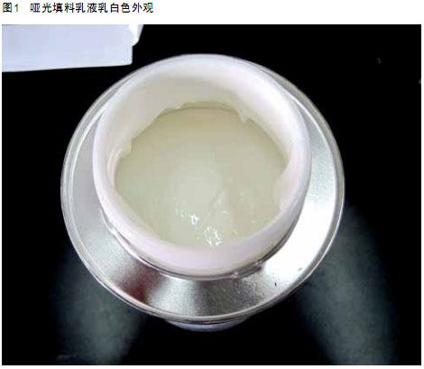 這種消光填料的物理性質見表1。 100%固體分的輻射固化基料不含溶劑,不含單體(活性稀釋劑),25°C時,黏度約為3 500 mPa·s,并呈現(xiàn)牛頓型特性。盡管外觀是乳白色的(圖1),但是在完全固化后則是透明的。