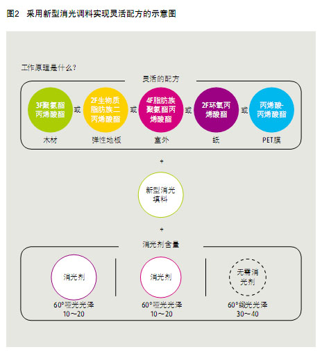 為滿足涂料配方設計者更靈活,更自由地設計配方,最大限度降低庫存和運輸成本,設計了一種新型消光填料,可以作為摻混料廣泛用于多種涂料體系(見圖 2):在紫外線的全波段范圍內或在發(fā)光二極管和電子束輻射下固化的涂料及傳統(tǒng) UV。