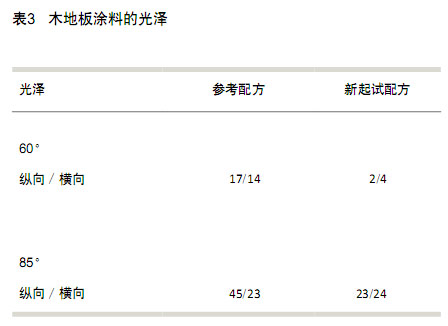 然后,分別將標準配方和新涂料配方按濕膜厚度25 μm涂覆到事前刷涂3道芳香族聚氨脂丙烯酸酯樹脂進行封閉處理的木板上。使用兩個80W Hg燈,以10 m/min 速度進行紫外光固化。沿著長度方向和橫向,對每一塊木板的光澤進行測量,結果如表3所示。