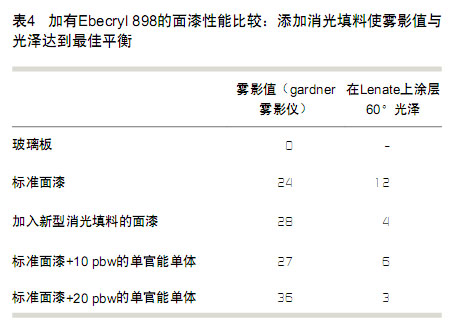 在玻璃上采用消光填料配制的涂料的霧影值略高于標準面漆的霧影值(28/ 24)。當涂覆在Leneta紙上時,光澤降低了3倍(4/12)。此外,對于標準配方,通過添加20 pbw的單官能單體而達到相同光澤度時,其霧影值上升到36。顯然,新型消光填料能夠配制出超低光澤涂料,透明度與傳統(tǒng)100%輻射固化系統(tǒng)(具有較高光澤)的透明度相似。