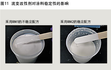 例如,在研磨料中加入五種不同的分散劑進行試驗評估,發現涂料的防腐性出現截然不同的結果(圖9)。為了深入了解這一結果的原因,采用SEM分析對涂料進行評估(圖10),結果令人震驚。當分散劑的疏水性越強時,二氧化鈦在醇酸樹脂涂料中的分散越好,從而防腐性能更好。因此必須選擇恰當的助劑,這對其他助劑,包括流變改性劑(RM)和消泡劑,也是一樣的。圖11顯示了RM1是如何導致了一個不穩定的涂料配方,而RM2能使涂料增稠,達到一定的黏度,而不會出現絮凝結塊。