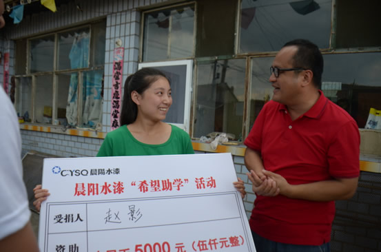 8月4日至5日,晨陽水漆聯合河北農民頻道《老三熱線》欄目組來到張家口市,開展以“春雨行動愛心助學”為主題的公益活動。在2015屆大學新生開學之前,為部分品學兼優的貧困學子送去愛心助學金,助其圓夢大學。