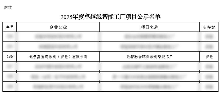 近日,工信部正式公示了2025年度卓越級智能工廠項目名單。經(jīng)過多輪嚴格評審,北新嘉寶莉涂料(安徽)有限公司打造的“數(shù)智融合環(huán)保涂料智能工廠”成功入選,榮獲國家級智能制造領(lǐng)域的重要認可,國家級名片再+1!