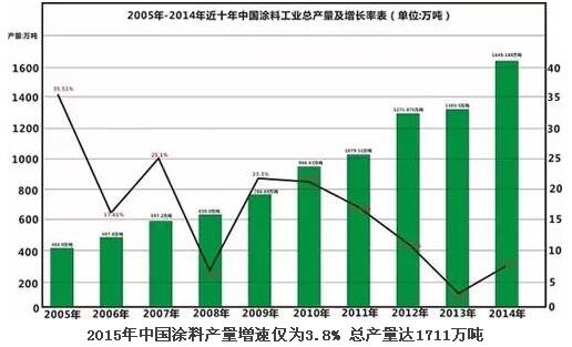 2015年中國涂料產量增速3.8% 總產量達1711萬噸