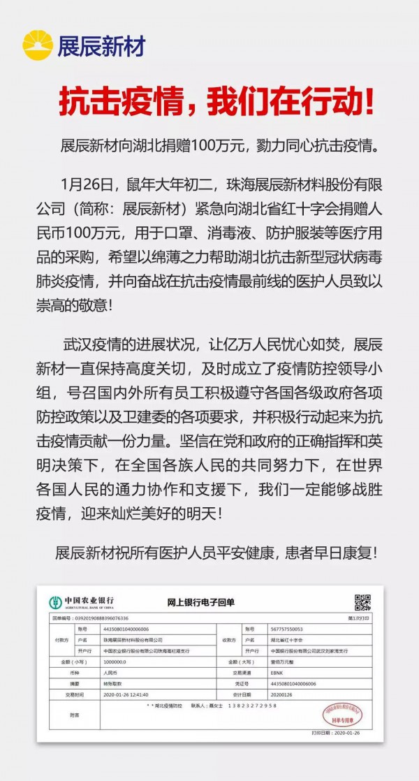 1月26日,鼠年大年初二,珠海展辰新材料股份有限公司(簡稱:展辰新材)緊急向湖北省紅十字會捐贈人民幣100萬元,用于口罩、消毒液、防護服裝等醫療用品的采購,希望以綿薄之力幫助湖北抗擊新型冠狀病毒肺炎疫情,并向奮戰在抗擊疫情最前線的醫護人員致以崇高的敬意!